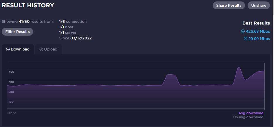 From my PC using Speedtest.org, randomly as I think ti do it); the missing 9 entries are when i have my VPN on; these are no a valid test of Cogeco’s performance).