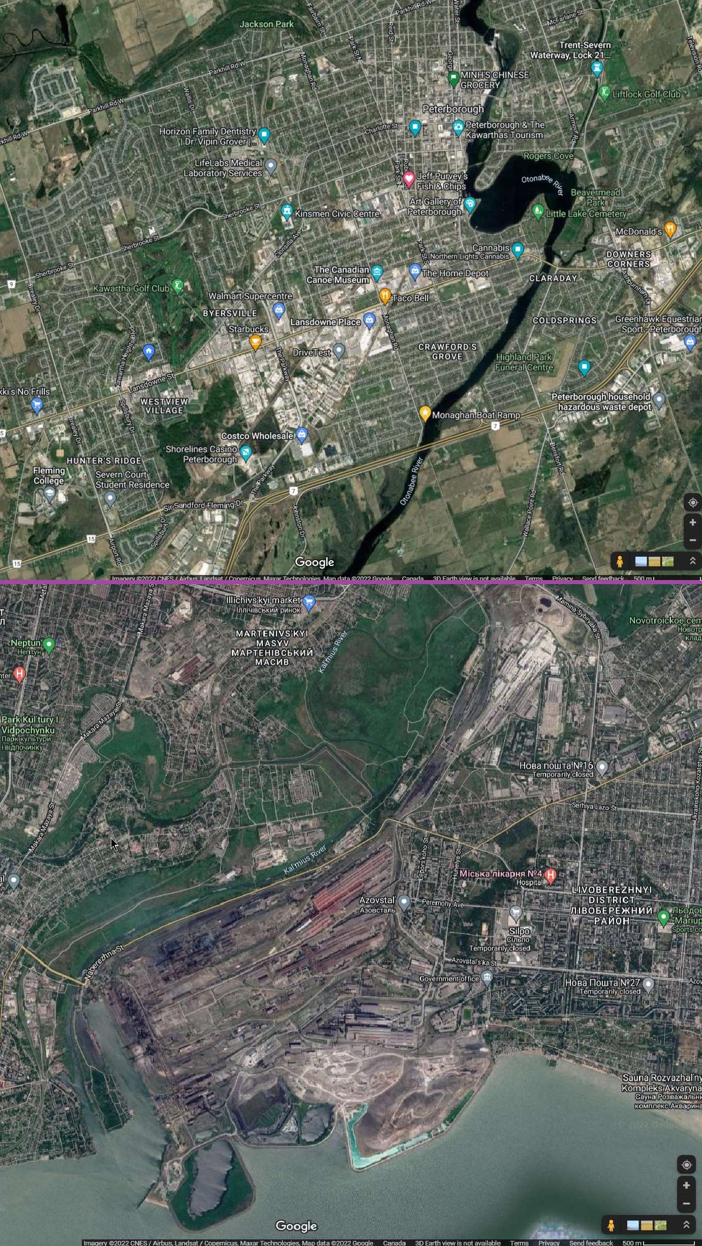 Or look at it this way… Here’s the GE property, outlined in Pete’s purple, familiar to most Peterborough residents, on the Avastol property: