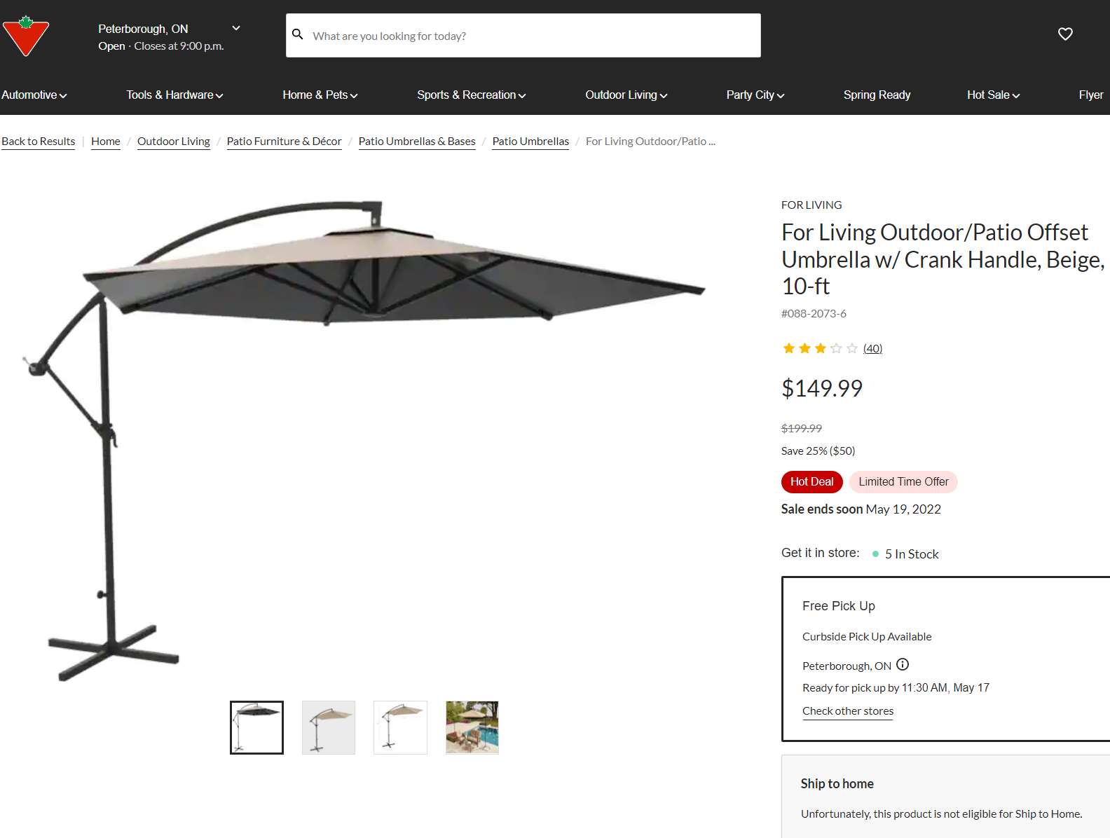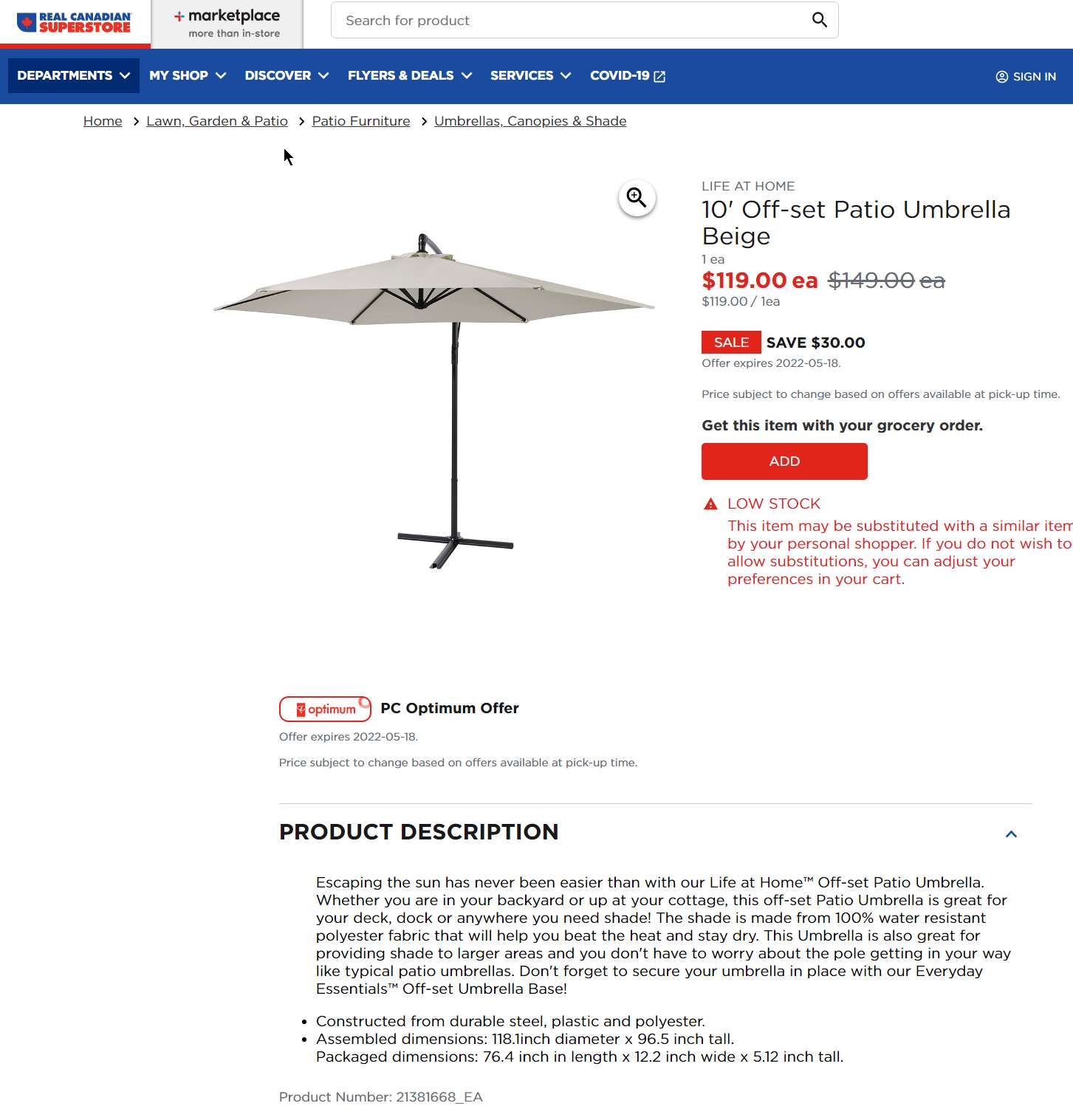 Posted in Article New umbrella for lower deck 2022-05-15 Leave a Comment on New umbrella for lower deck Can’t open the existing. jams. Maybe try to fix? $119 from RCSS:$159 from JYSK:$150 from CrappyTire