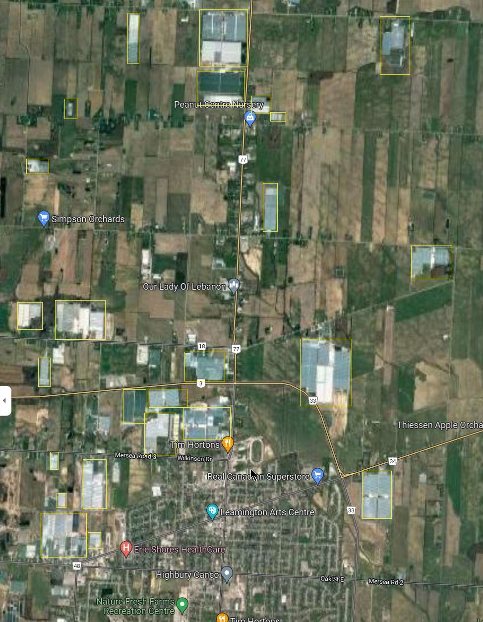 Recall seeing very large greenhouses down near Leamington, Ont. in spring 2022 (all the yellow squares in the Google maps snip are greenhouses):