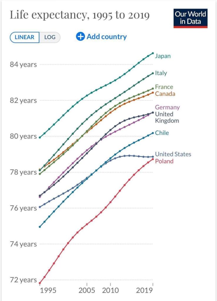 Posted in Article American Exceptionalism – Life Expectancy, 1995-2019 2022-07-08 Leave a Comment on American Exceptionalism – Life Expectancy, 1995-2019 I was going to edit this to highlight the USA’s plateau starting ~2011. But it’s obvious enough by itself. WTF happened in 2011 that caused this?