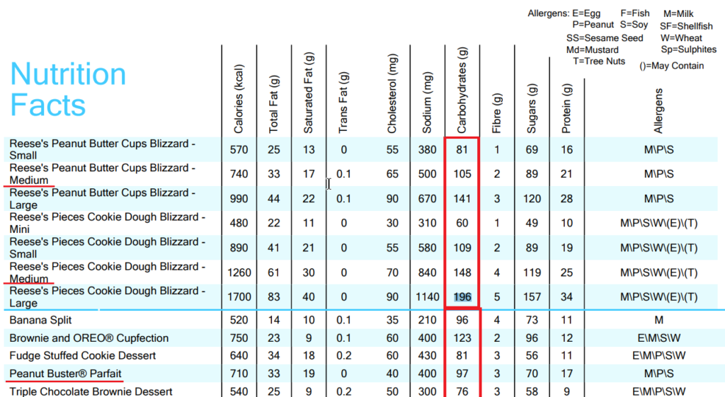As a diabetic, I should choose the lowest carbs. This chart shows my options for my “standard” order.