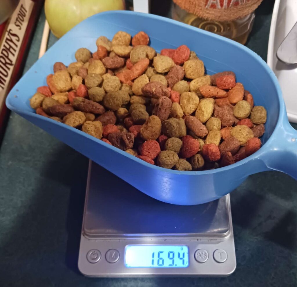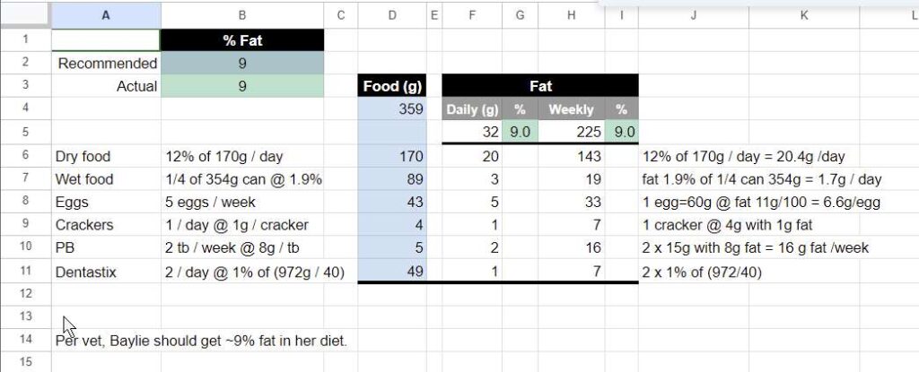 2023-04-01 – if this spreadsheet is correct, then she’s getting exactly what the vet recommends. Suspisiously so. But I can’t find anything wrong with the spreadsheet…. although shouldn’t the Daily % and Weekly % be the same?