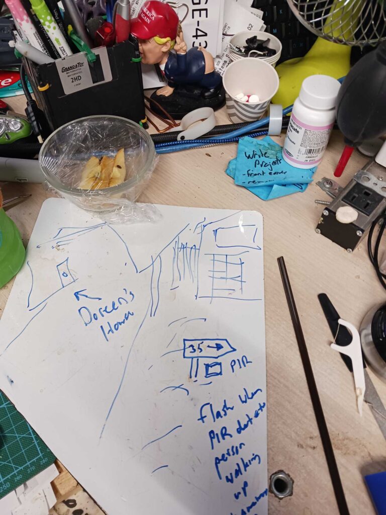 flashes when pir sensor detrects person or vehicle; maybe an audio cue too, like a bell ring? wuld be ideal to ignore doreen, but how? do pir sensors ignore cars? or would it trip on the hot front face of the car? solar powered, of course.