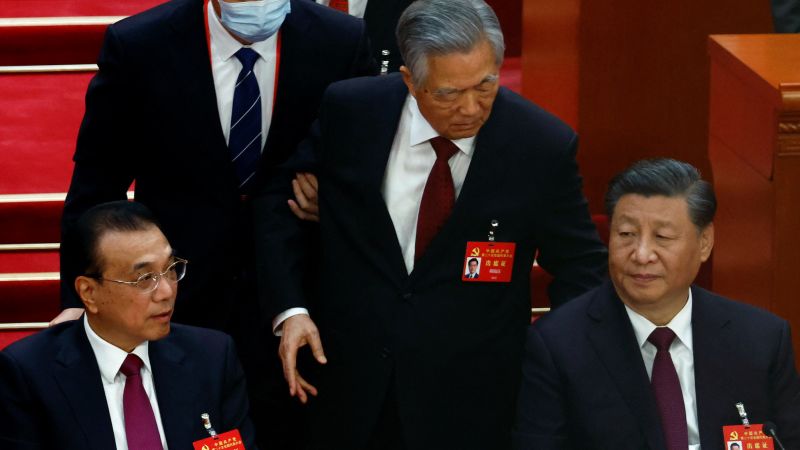 Posted in Article Former Chinese leader Hu Jintao unexpectedly led out of room as Party Congress comes to a close | CNN 2022-10-22 Leave a Comment on Former Chinese leader Hu Jintao unexpectedly led out of room as Party Congress comes to a close | CNN China’s former top leader, Hu Jintao, was unexpectedly led out of Saturday’s closing ceremony of the Communist Party Congress, in a moment of drama during what is typically a highly choreographed event. Source: Former Chinese leader Hu Jintao unexpectedly led out of room as Party Congress comes to a close | CNN