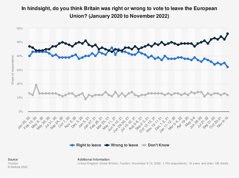 Posted in Article Brexit regret? 2022-11-21 Leave a Comment on Brexit regret? As of November 2022, 56 percent of people in Great Britain thought that it was wrong to leave the European Union, compared with 32 percent who thought it was the right decision. Source: