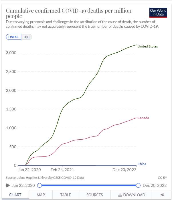 did the China zero-covid policy ending after the protests in late 2022-11 be a good strategy by waiting until a less deadly variant (omicron) become dominant? so everyone’s going to get it, best to wait until it’s less deadly before opening up? ~2m dead of 1400m people is 0.001/m, whereas USA (1.1m / 330m =0.003/m) or Canada (.049m / 37m = .001/m) which matches this (ignoring the likely incorrect by huge factor for China… unless it’s true… will we ever know?)