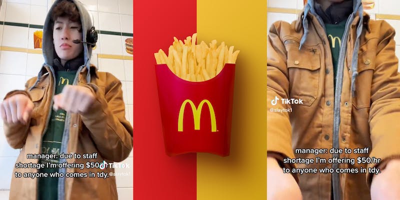 Posted in Article ‘Catch me working all 24 hrs’: McDonald’s worker says manager gave employees $50 an hour to get them to work during staff shortage 2023-01-04 Leave a Comment on ‘Catch me working all 24 hrs’: McDonald’s worker says manager gave employees $50 an hour to get them to work during staff shortage TikToker @slaytok1 says that the manager of his McDonald’s offered $50 an hour on a certain day due to staff shortages. Source: ‘Catch me working all 24 hrs’: McDonald’s worker says manager gave employees $50 an hour to get them to work during staff shortage