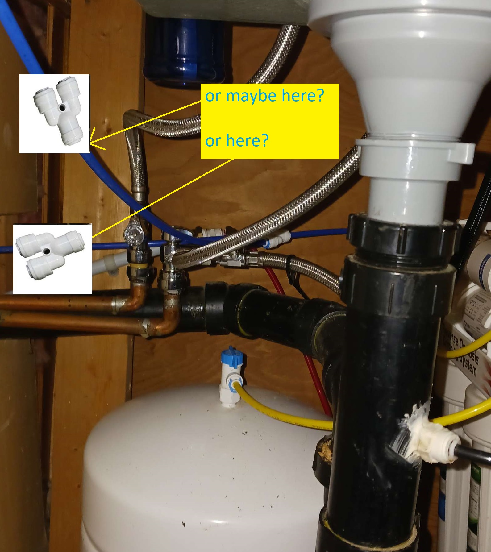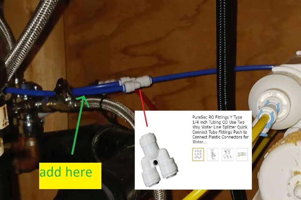 2023-03-04 – connecting water supply to bar sink filter; here are some pics; we need to T into one of the ougoing lines; there should be Y connectors in a bag with lots of other 1/4″ tubing & such in garage; bring all in.
