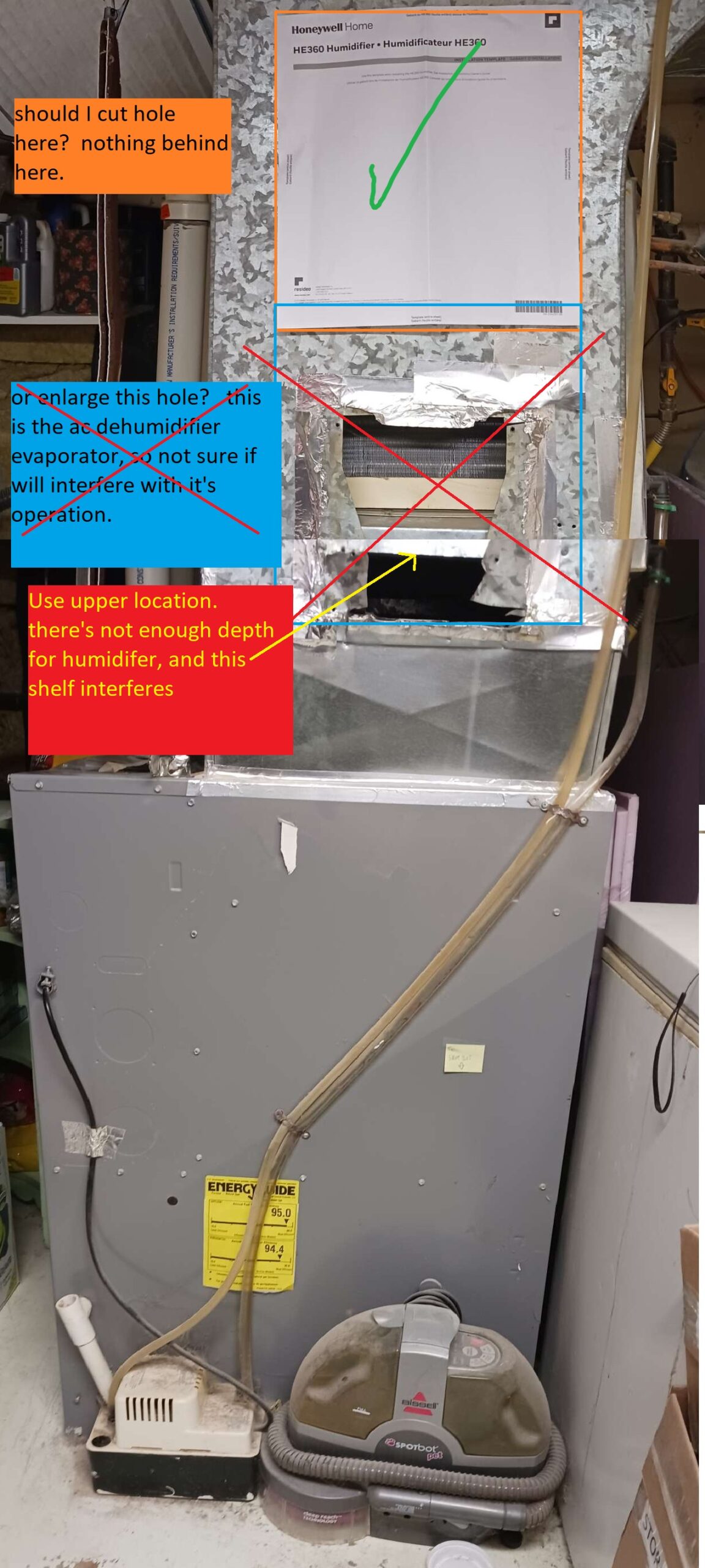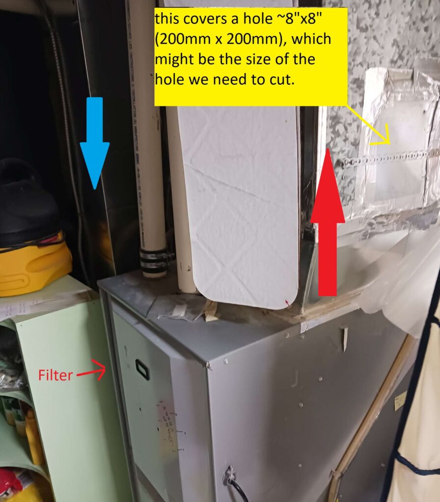 This should mount on the warm air side of the furnance; conveniently, there is a pre-cut hole in this duct; i had to cover it with tape & strap ’cause it would leak air. this covers a hole ~8″x8″ (200mm x 200mm), which might be the size of the hole we need to cut. honeywell manual doesn’t say size. NO! see pics below.