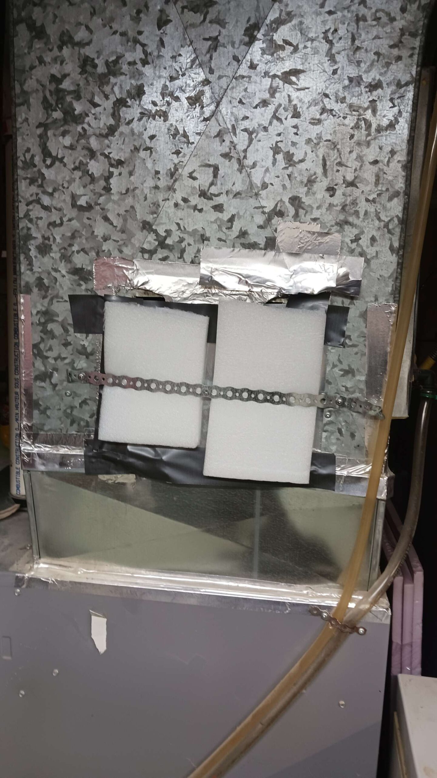 2023-03-04 – temporarily patched up the AC; will replace this cover with something better later. maybe we have a pc of pc case or other alimnum to make a nice panel. or what dows 12″x12″ panel cover cost?
