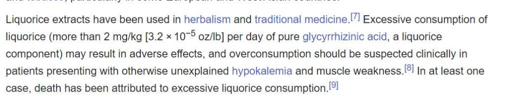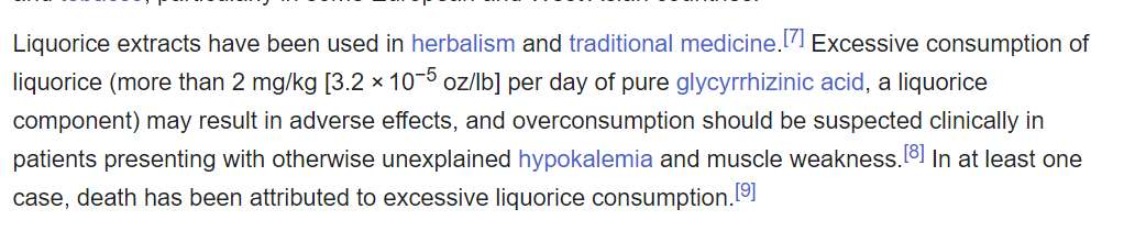 So excessive intake for me is ~2mg/kg * 110kg = 220mg of pure Glycyrrhizin, but sadly, without knowing the concentration of Glycyrrhizin in any given type of licorice, it’s going to hard to make any determination. also, no answer at the Wikipedia level (above snips). probably need to go deeper. links to some of the Wikipedia footnotes here:’