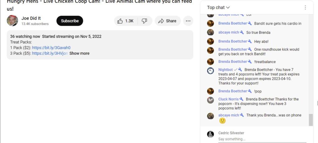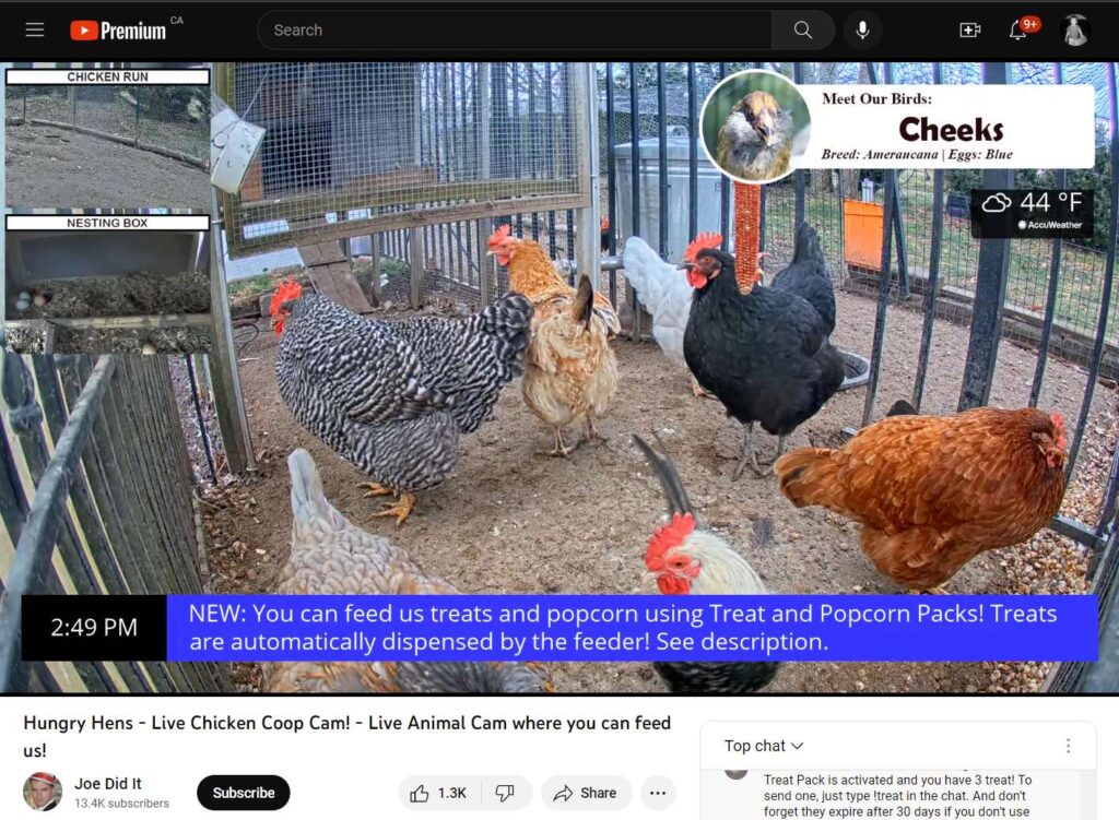 In the same vein as live airplane spotting at Pearson, setup a chicken cam, charge for packets, packets exchanged for feedings. popcorn ok for chickens? not sure how much he’s making, seems to get regular superchats but doesn’t show the value like most folks do. 13K subs, not sure how many watching. has some sort of chat bot that handles all the transactions.