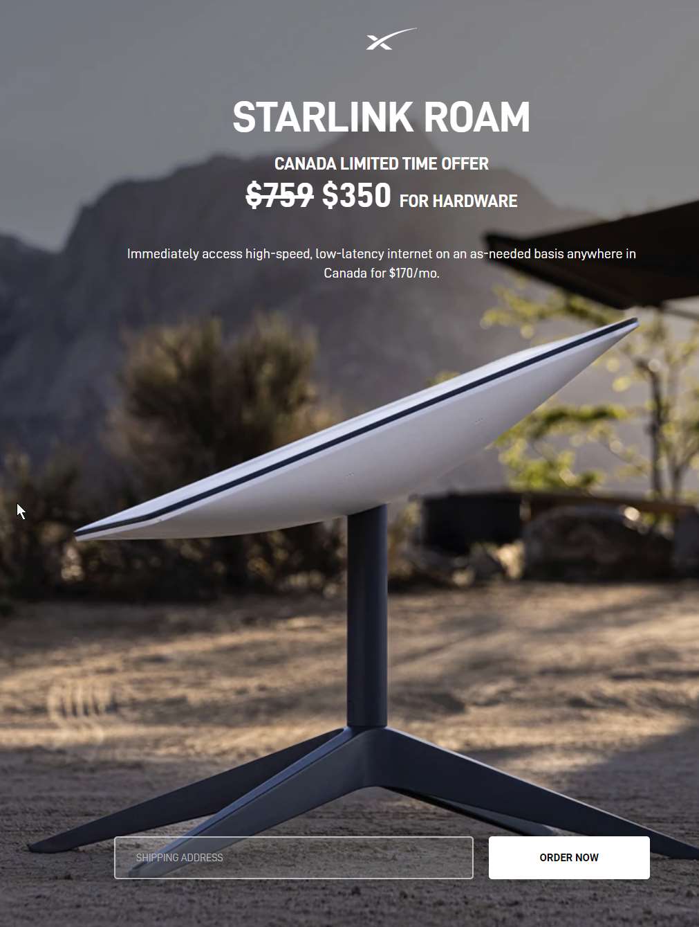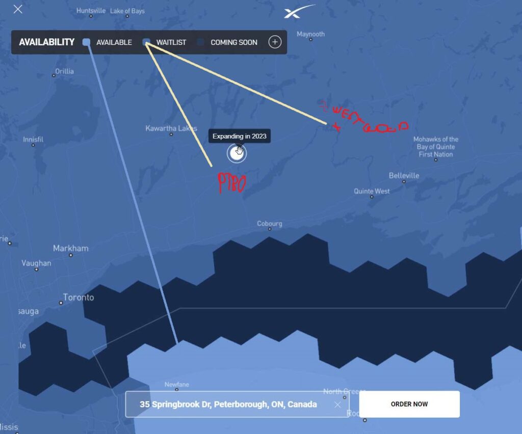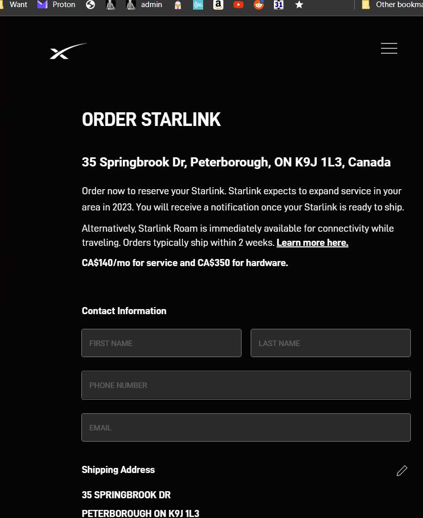 2023-03-13~ – got email from Starlink with 50% off hardware (“Dishy” + router?), so C$350, then C$140/month. Sadly, we’re still in “Waitlist”; Bev & Hugh too. But the order form is ready to take our money and deliver something in 2023.