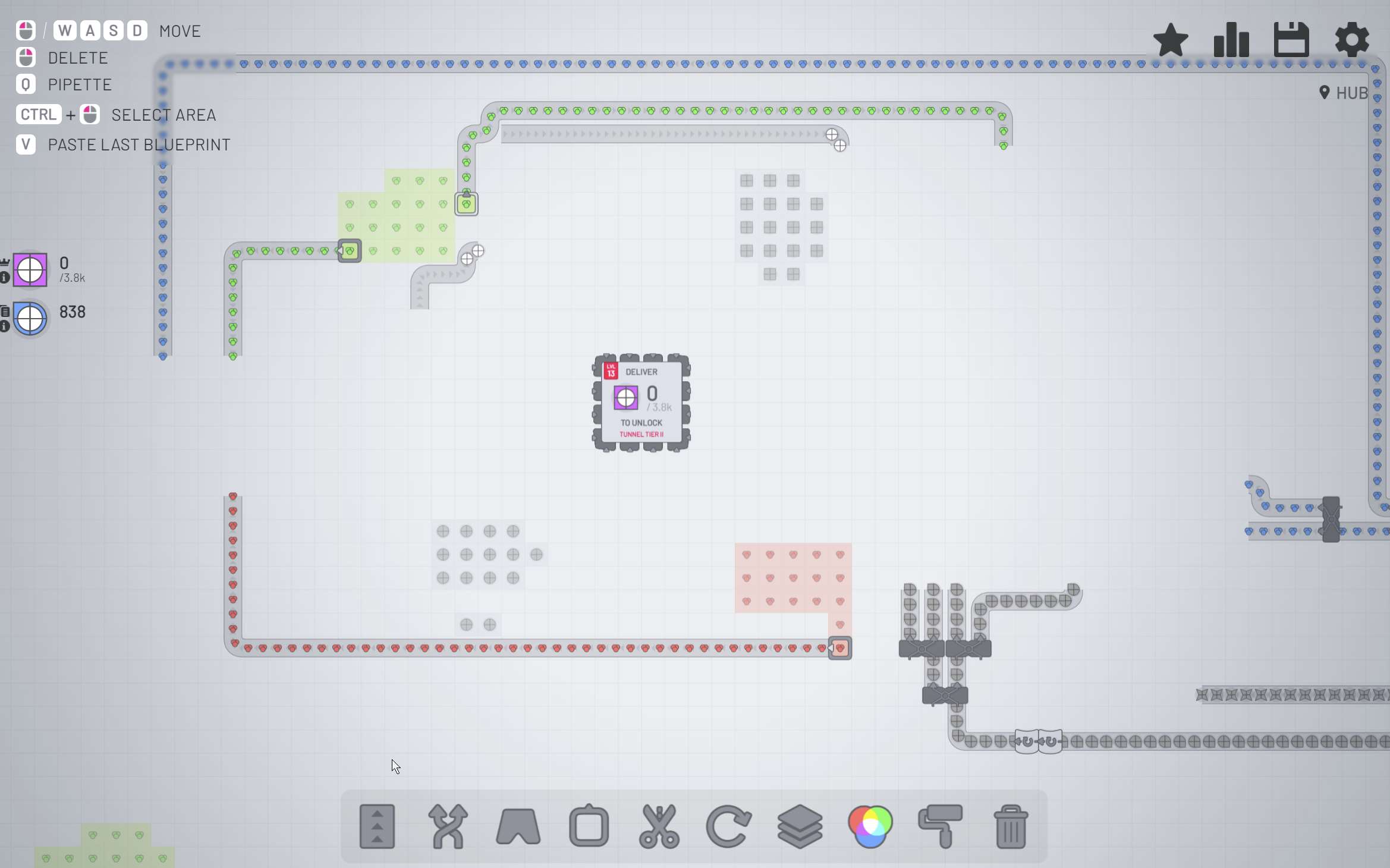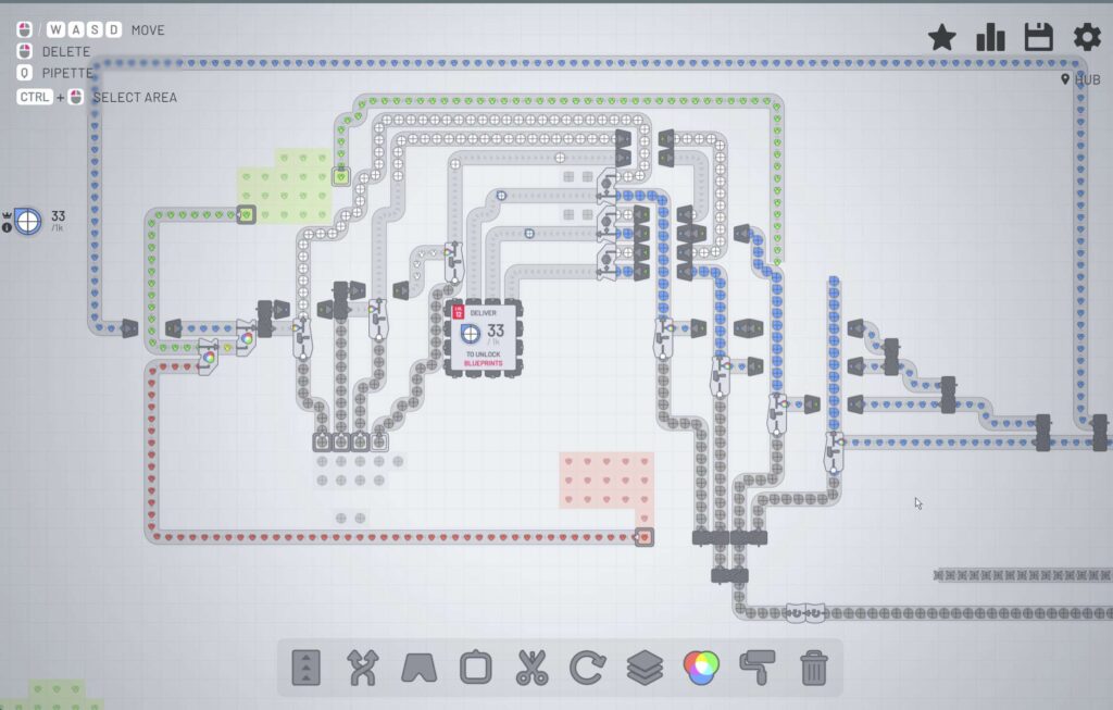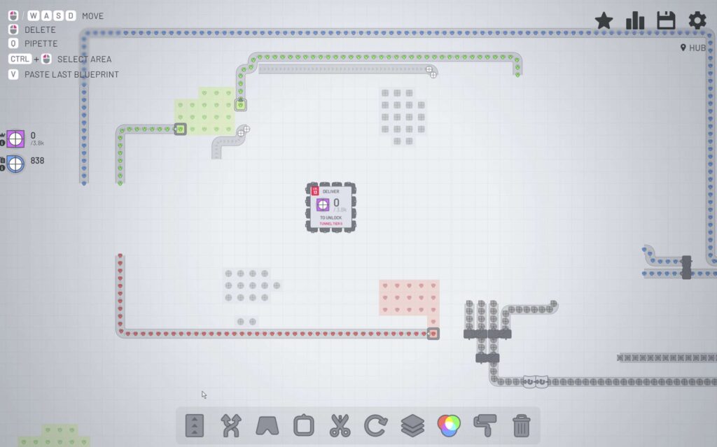 2023-04-10 – something clicked and I get the goal of Shapez. On level 12 of the game/tutorial? i was able to get 3 inputs to the hub; this means 24 units/min, so 1k/24 = ~40 mins; from this mess:
