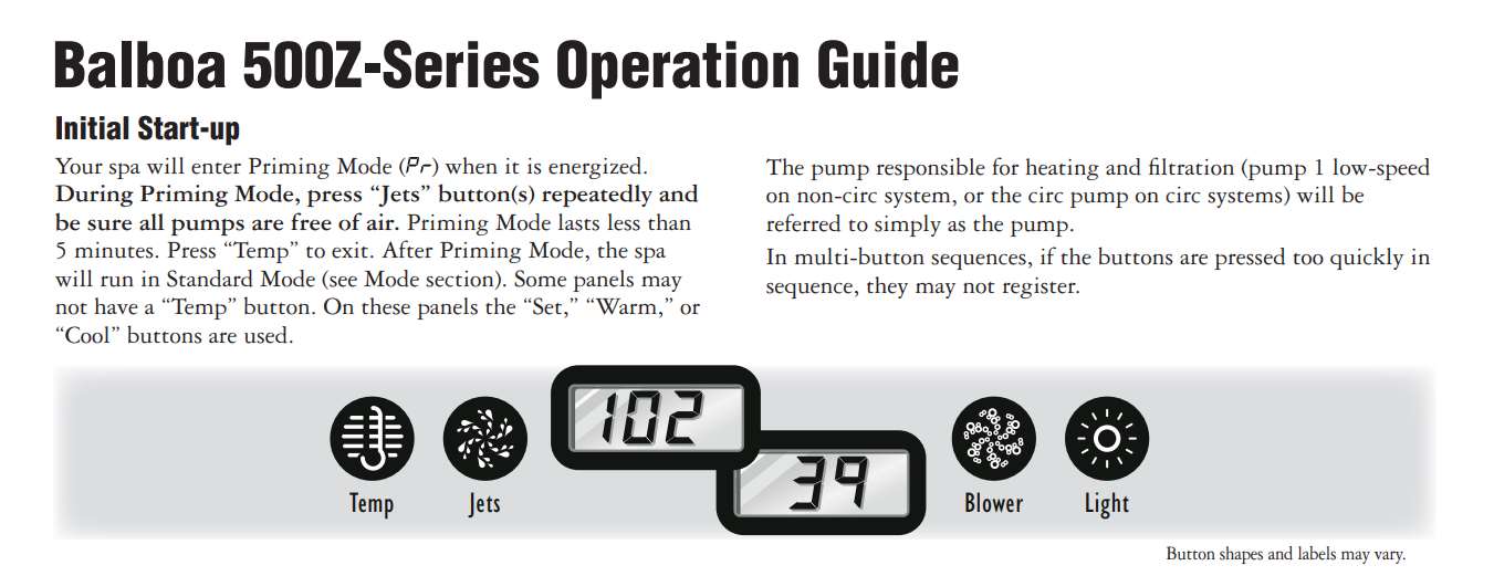 - the pump should come on; the system is in priming mode for 5 minutes. display will show “Pr”. press the Jet button to tunr the punmp to low speed; fill filter or whevs until priming is complete and water is flowing out of jets