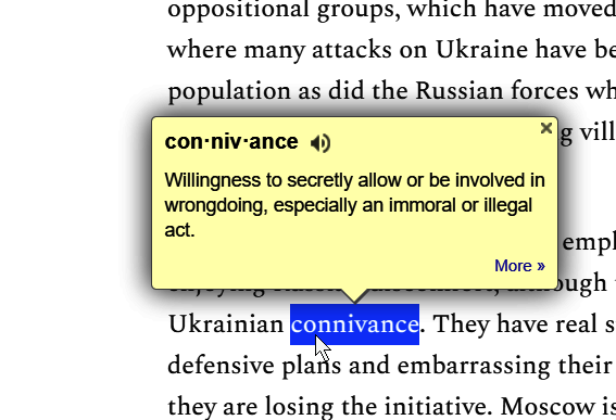 This snip is an example of an essential Chrome extension called “Google Dictionary. 2click a word and automagically Chrome does a definition lookup and pops it up above the word.