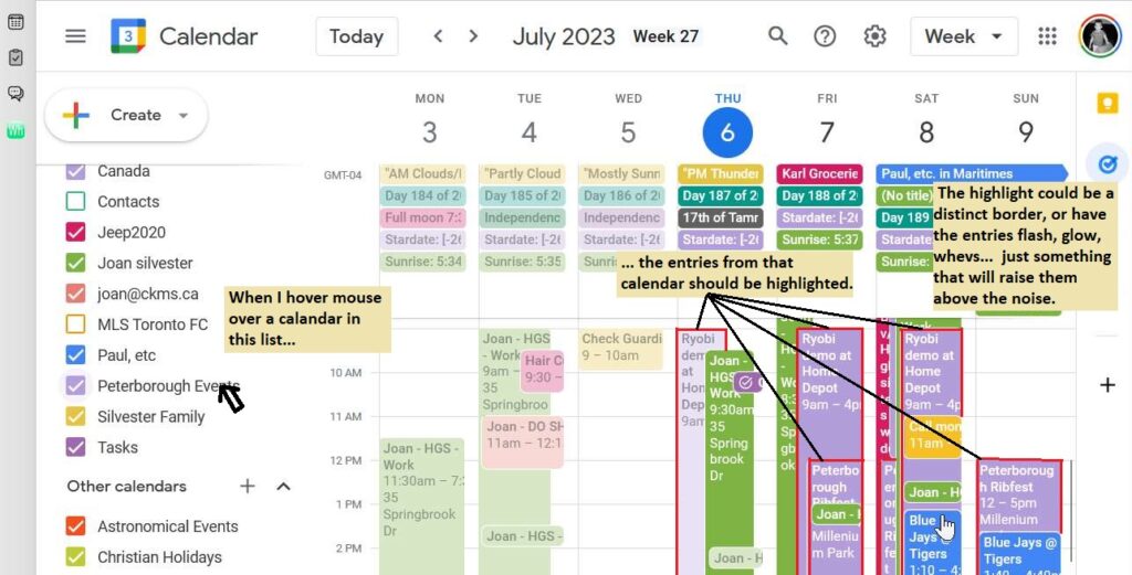 The snip below says it all. This example is from Thunderbird plugin called Lightning (might be a standard part of Thunderbird?); this applies to all calendars and other apps that need this. Wjhen the info is too dense, a method of rasiing the desiired info seems required. asi move the mouse over the list of calendars, events should highlight, without chaninging the Z-order or hiding other things.