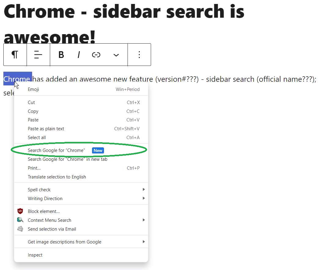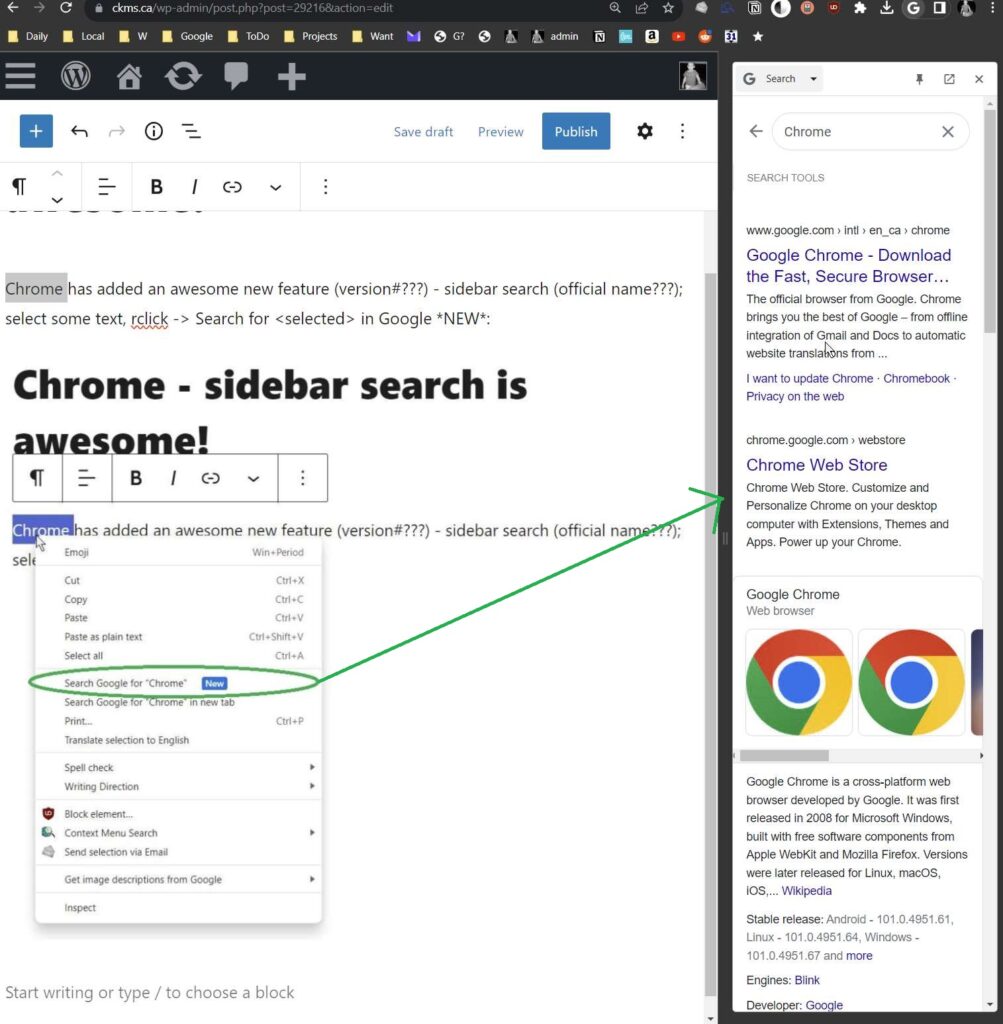 Chrome has added an awesome new feature (as of Version 116.0.5845.112 (Official Build) (64-bit)) – sidebar search (official name???); select some text -> rclick -> Search for <selected> in Google *NEW*: