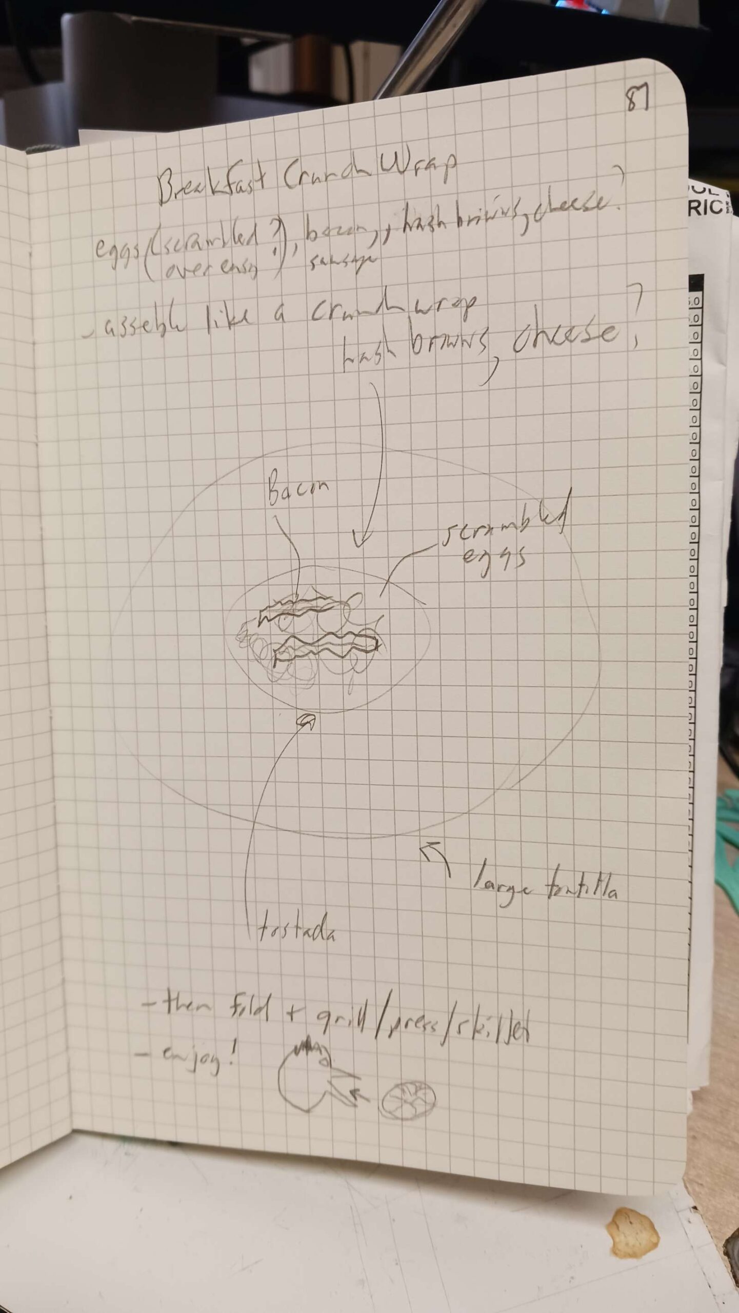 imagine a Taco Bell Crunch Wrap Supreme™️ and a Tim Horton’s Bacon|Sausage Breakfast Sandwich had a baby; same structure; 1x 14″ tortilla, 1x 4″ tostada, 2x scrambled | over-easy eggs, 2x strips bacon | sauasage, hash browns?, shredded cheese [type?]; assemble like a Crunch Wrap; serve with sour cream | creme fresh, green | red salsa (whynotboth.jpg), etc.