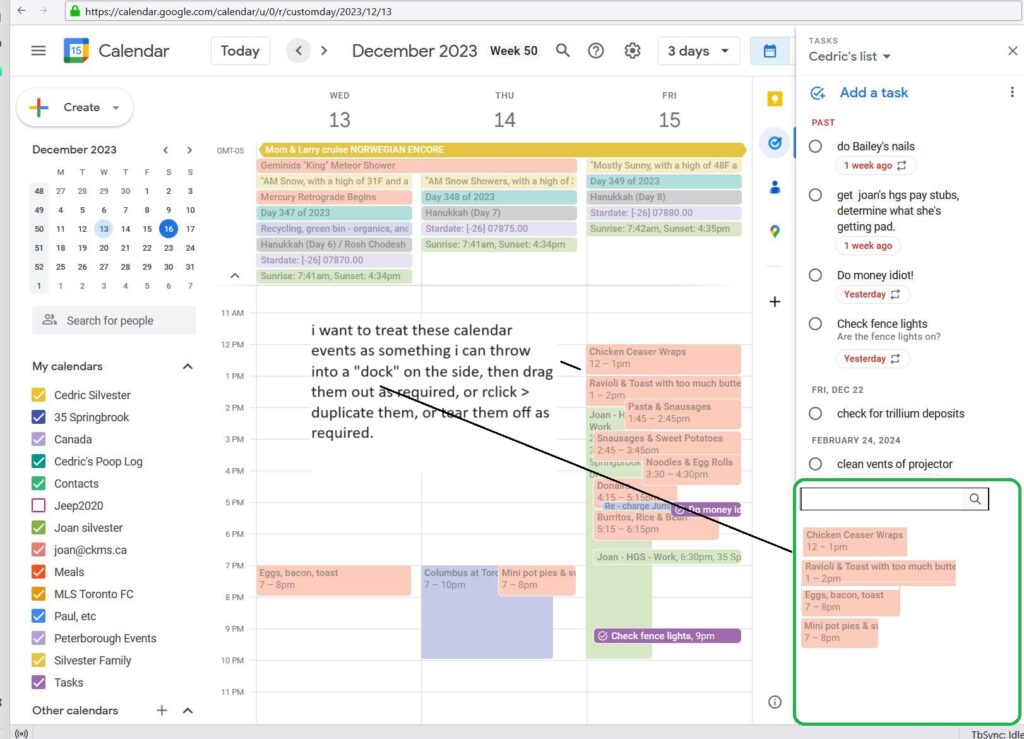 Test test okay so what I’m trying to explain here is how I would like to have Thunderbirds calendar integration which it used to be called lightning but now I think it’s just part of the standard Thunderbird thing or maybe it isn’t that on add-ons and themes Google which is a extension so and or I would like this in Google Calendar itself so this is an idea for how I how I am I should be recording this too shouldn’t I hang on a second so that would be a I want to bring up a new number I want to break up with you what the f* do you want to bring up a new thing recording so I said it’s running cool shift car I should probably make a different thing no it was we got the memory okay so cancel record okay so again this is so looking at Google calendar looking at how I do meal planning each of these is just a half hour or 1 hour appointments for what we’re going to have for supper schedule our famous chicken caesar wraps a ravioli and toast with too much butter on the toasts past it’s sausages and sweet peas each one of these now I would like if they could be some sort of real recipe driven thing and I suppose that you could be done in the link so right now now I’ve got I’ll get out I got that 12 soup should be moved from the zombie stores this is part of some Zombie Thing zombie storage which I should document somewhere all right this is Saturday so are we going to have now this is awkward because that’s on because calendar view let’s go to the 5-day View and maybe we can see yeah they are so let’s see so I think tomorrow I said we should have now I just composing an email to John about this which I do every week we should have burritos tomorrow right so burritos at 7:00 p.m. Pictures on Sunday out here we get messed up so we can also do another way we can say it’s not just brussel sprouts right there or sweet potatoes oh it’s not that hot it’s move him too one day done I will just time later ah duplicate him to Tuesday and I restore recording over here yep so save that I leave these in there because well I lost not accurate it up I just changes turn off all these other calendars or going up into here or do the search or maybe some other way but it’s never easy but hang out so back to this so who’s f* noodles and egg rolls I would like to move them to Wednesday next week sure chickens again it’s become a it’s a fade so keep on the right click on those ear left click on yeah right click to contacts menu but there’s nothing in the context menu then it out so and then these guys well what I want to do is sort of have them in a dock or something like I could just drop them into there for now to store them and then later I could you know just by simply write or click edit duplicate drag and drop should be able to get them under the calendar where I want to go for now I will move them I don’t know move them all the way to next week I guess I I can multi Slack no I don’t think I did that so if these guys I can move all the next Saturday which is a bit of a pain I can just make everything a little bit bigger yeah so they were over yesterday yeah where’s all those meals right there actually works as a little awkward but yeah so tomorrow burritos chicken caesar wraps then next week it’s not just and sweet potatoes are probably Rock whatever we got for supper I should be there of course social is coming up see right now what I do is I put them up here in the can I try to put them out of a out of the way but so I can see them also they’re not so that’s sort of how I do it but how again I would like to have these things treated as some something that could be docked or put away and then you know and of course what I was talking about in terms of terms of terms of these actually not being arrested just right now they’re just a right they’re just calendar entries I’ll delete them let’s go look what we can do here so for the instance what we do is we’re still recording the video here yeah probably is that I know I’ll try it out I forgot nowhere so I mean we could hear a description we could this could be a link to our recipe so for instance chicken caesar abs I can link to me where’s the world I gave it type the actual recipe in here but then you know it’s not it’s in my calendar I don’t like that so how about I think what I like to do I mean I’ve got an ocean I know I’ve got a recipe thing sort of started see if I can go to them recipes so yeah so let’s say I’ll let bacon and toast 6 eggs but I can share that I see to come allowed to that I can publish to a static website mother f** so there we are so I put the link in there girl you boxes come from I already had it in it no I didn’t sun’s not bad sorry that what I just did there was is in Thunderbirds Google Calendar plugin it distributed the recipes across next week for a few quick duplicates and and our Dragon drops depending on which was more convenient then I made some links to the notion based recipes which I’ve experimented with you have a it also has kind of nice drag and dropping thing that I might be better but I don’t know which way to pursue with that so I got some test recipes and there are notion LinkedIn on the road have a boo and see how they look there’s also the ability to do it on the blog cuz I do have recipe plug-in of some sort which basically makes recipes really nice but again important so so I’ll stop recording how do I stop recording this stupid thing again I’m not talking to sirius right there Bang found them all right so saving the file as recording 166 and probably could be added it down to 20 seconds 30 seconds of make a simulator so that the doctor I was thinking about for recipe cards all right done this and then I’m going to store the text of this in the Stream Consciousness and then I don’t know becomes a project I guess on the blog so I can track it and maybe get it done bye