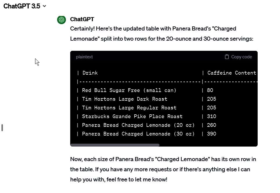 but became this when I pasted the code from the last ChatGPT output, with at least basic table formatting correct; I wonder if the table ChatGPT was outputting is a standardized format, it sorta looks like sql; must check this data and fix a bit, then maybe try to fix the size column units; and then see if ChatGPT can add other energy drinks, like *$ espresso, monster, etc BUT BE SURE to validate the data so far!!.; i feel weirdly afraid to break something, but then I can always just tell ChatGPT to just revert, so far that’s been working for the few simple things I’ve tried. it would be uinteresting to ask someone with little/some/good/excellent computer skills to create this data ffrom ina google sheet or excel perhaps their own =searches?
