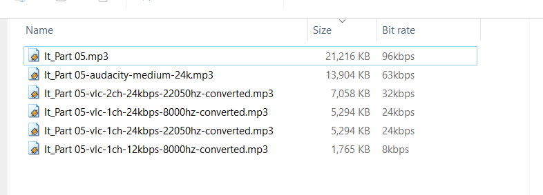 what about if resampled via vlc? to 24kbps? how low can we go before it’s ovbjectionably bnad? here’s some results; put in table below. in my opinion, the second smallest file was accptable; the smallest file was bad enough to be annoying.