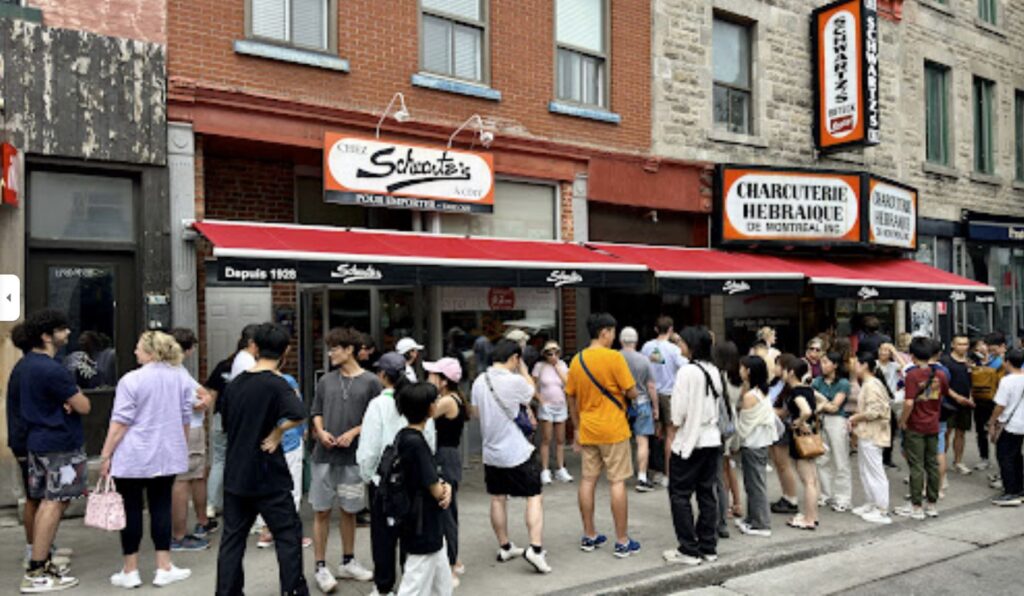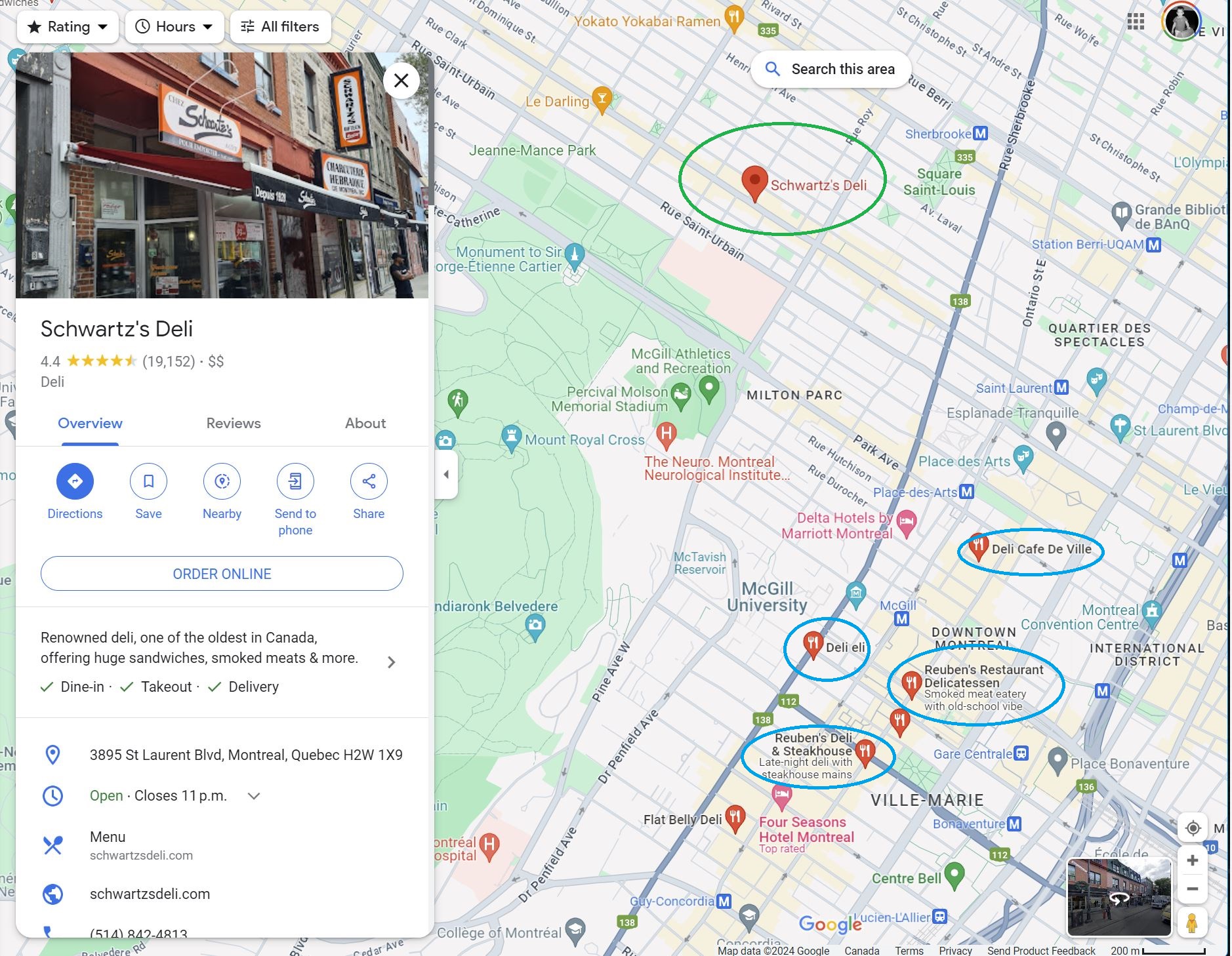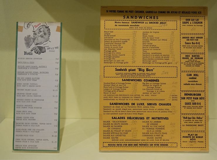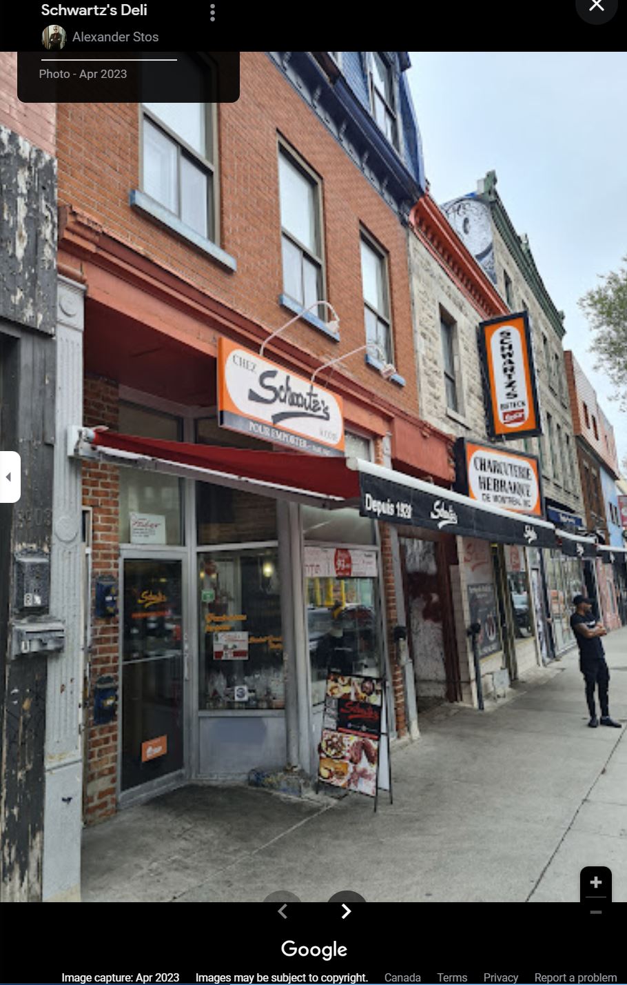 and we know it’s good, ’cause pretty sure last time we were in Montreal, we went to Schwartz’s, not Ben’s. The last time I was at Ben’s was when I was coming home from Trois Rivière, rushing back to join Joan at the Holiday Inn in Ptbo for our 10th anniversary (so ~2000-04-28); she said I either arrive by 6pm or she’d pick someone else to celebrate our 10th. I go there with time to spare, big jar of pickles, a few lbs of meat, and a couple loaves of the rye bread they use.
