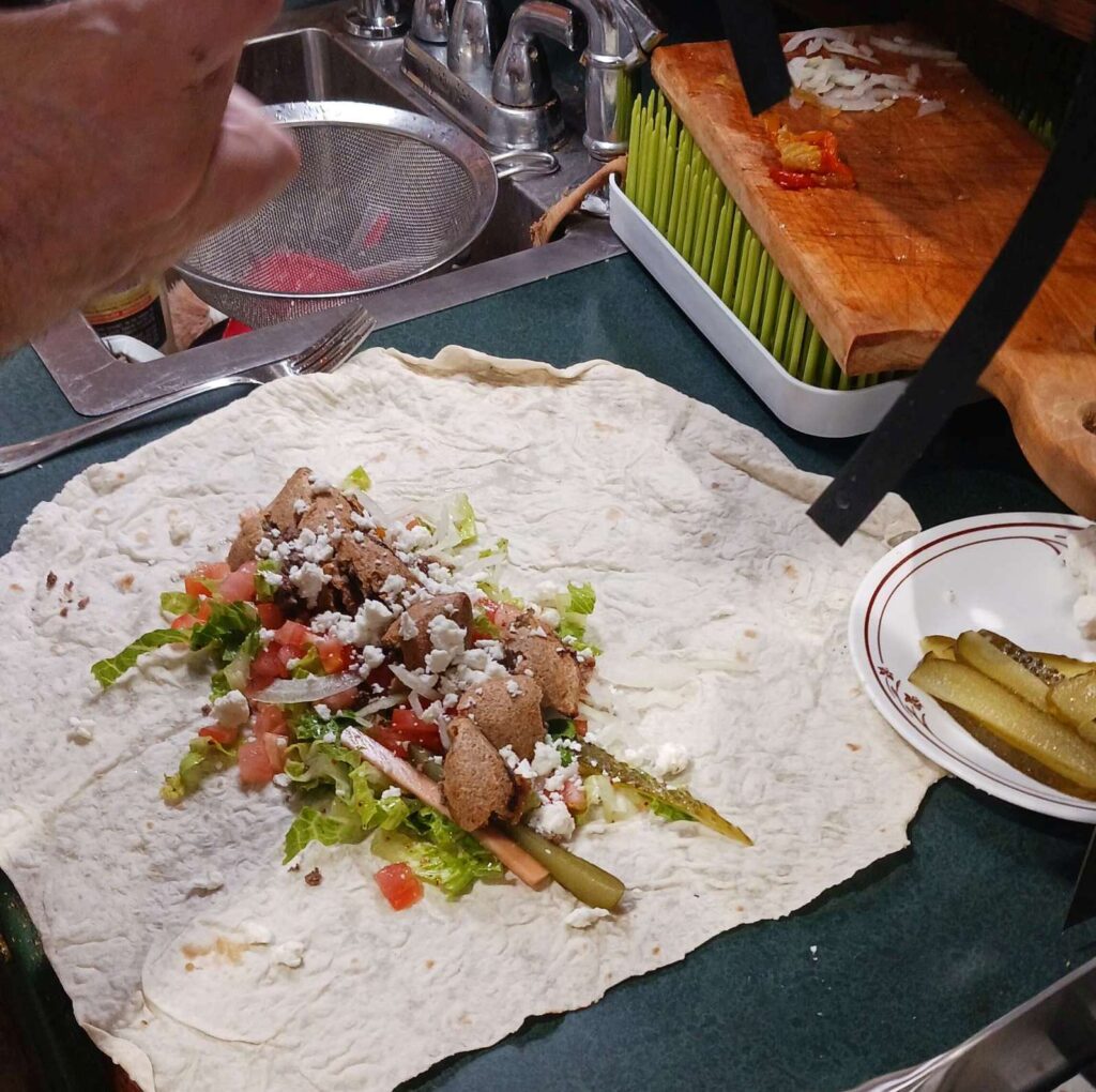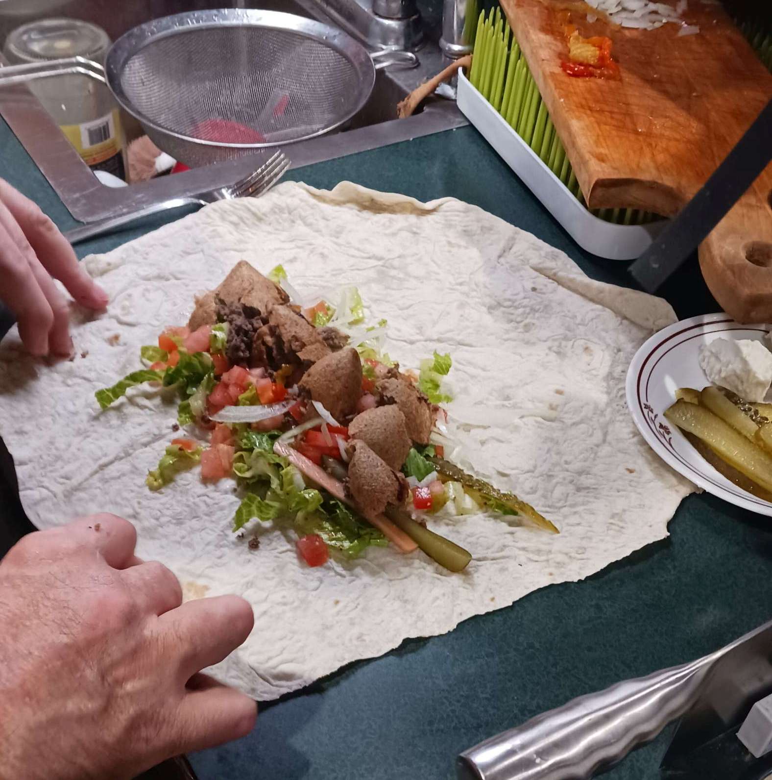 lavash bread from local restaurant “Kebab on Lavash“, made fresh today, $2 per wrap. Chicken Kibbeh, simple salad, onions, pickled turnip (homemade!), onion, pickles (last one in the jar from Schwartz’s), hot banana peppers, feta cheese, tomatoes (on Joan’s). Yummy!
