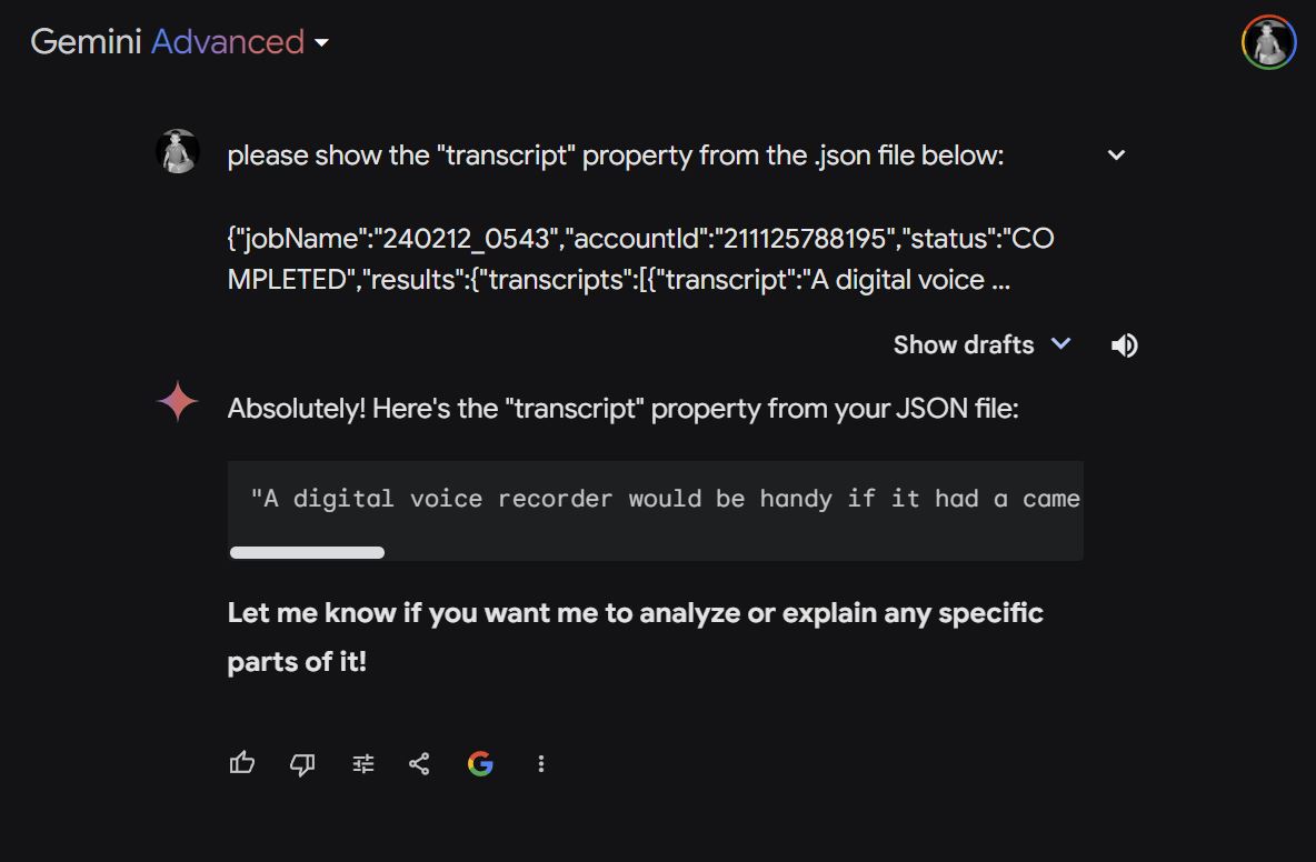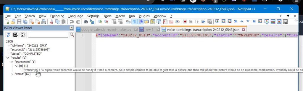 extracting text of the transcription from a .json file is trivial; Gemini+ did it: