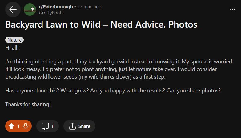 I want to re-wild the lower part of the backyard; just stop mowing and see what grows. Joan is worried it won’t look good. So I thought I would seek advice and (hopefully) pics of other locals that have done this. Post will be to Reddit’s /r/peterborough subreddit: