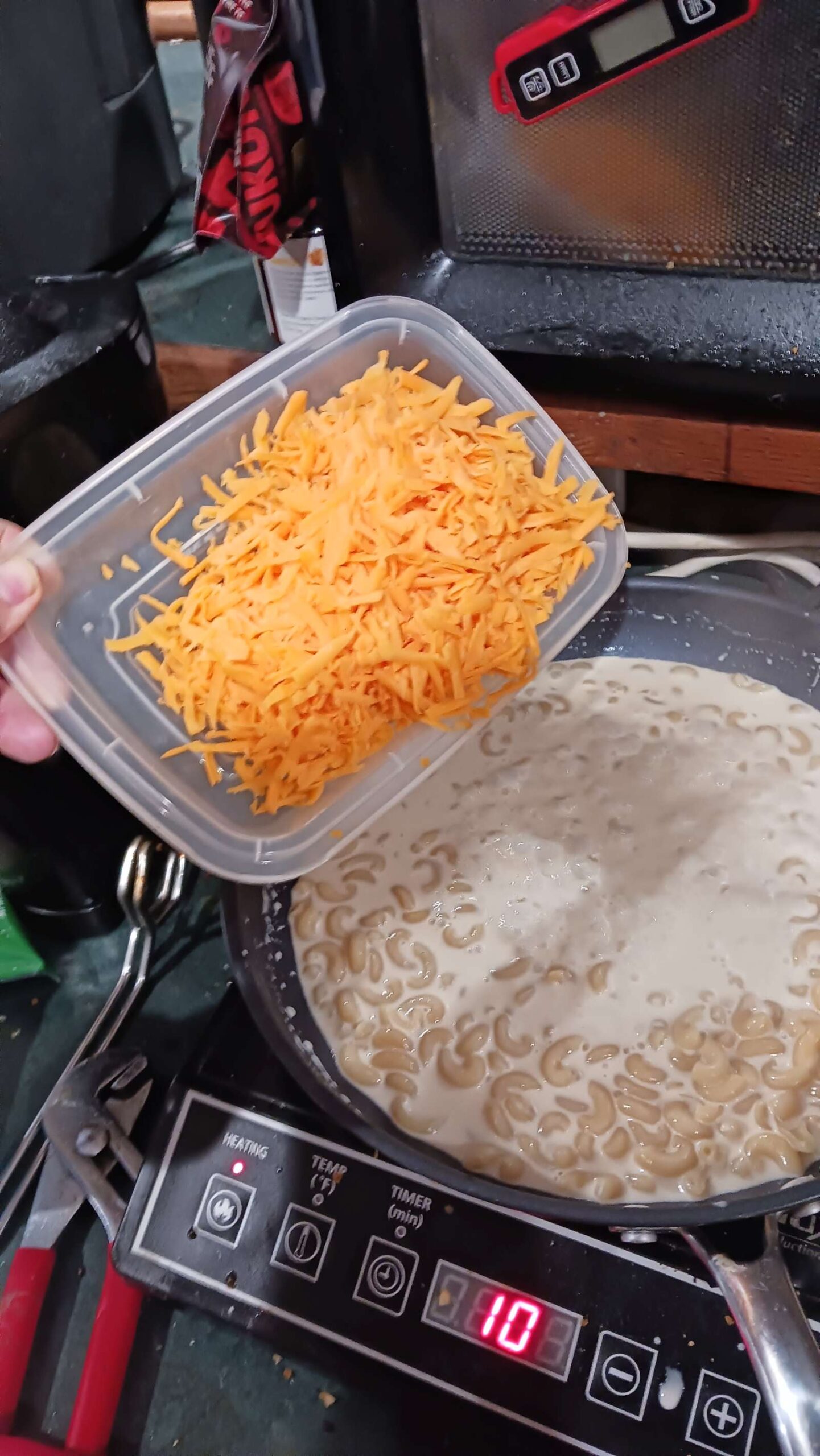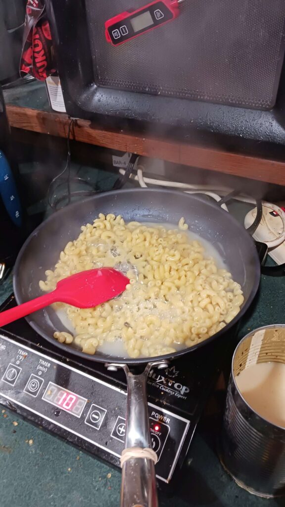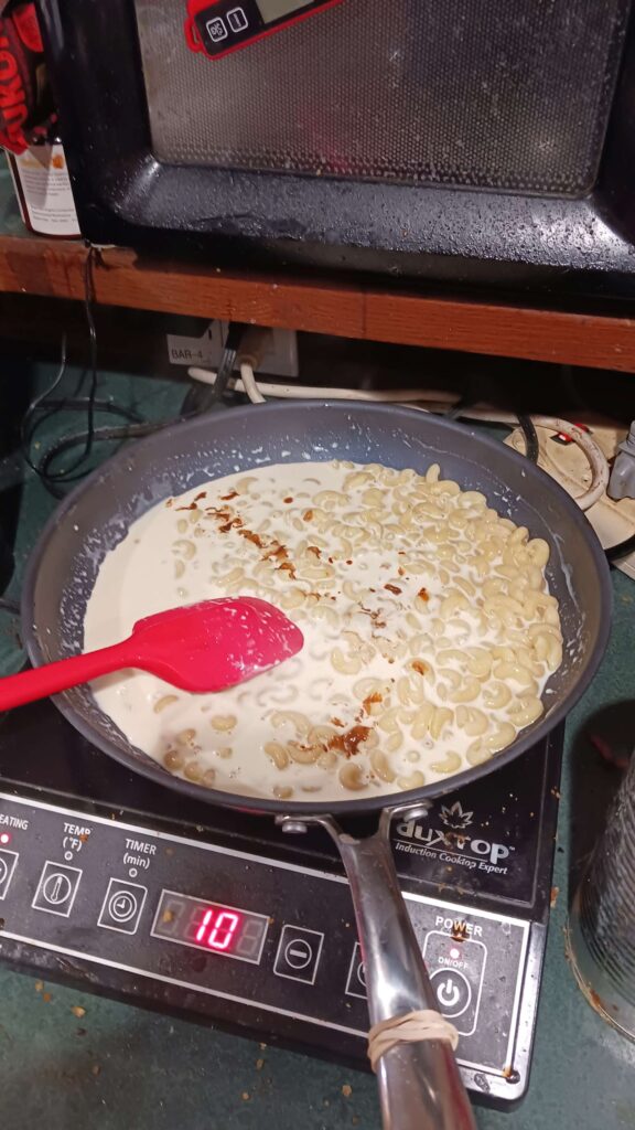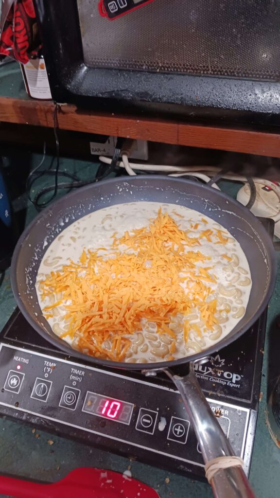 very simple,minimal ingredients (elebow pasta, 1/2 can evaporated milk, shredded cheddar, salt), and tasty af. but leaves a large skillet mess, typically burned on cheese & milk sauce. maybe need to go lower temperature for last bit?