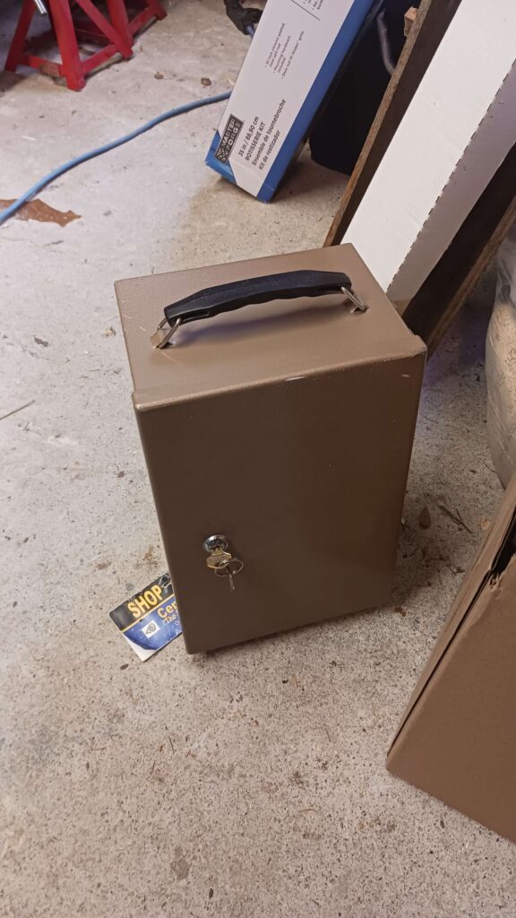 Brown metal box, hinged cover, carry handle, lock with 2 keys.
