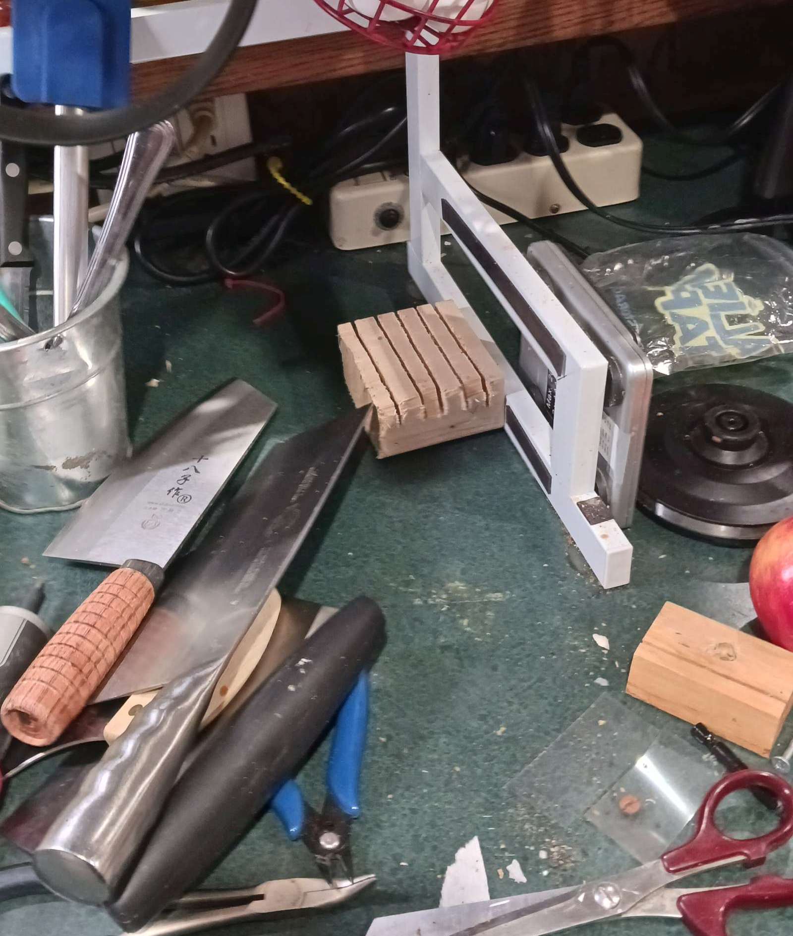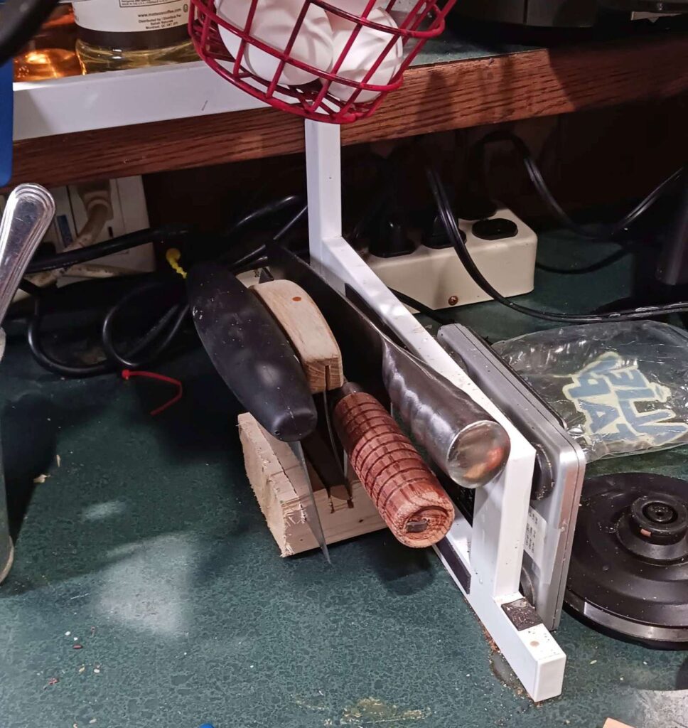 simple wood block with slots cut in with circular saw. blade is a little too wide, leading to floppyness. maybe try the 4.5″ one-handed saw. or use manual saw for more precise. currently stuck to rthe bar with Alien Tape. if i ever make a nice version i’ll screw it to the counter.