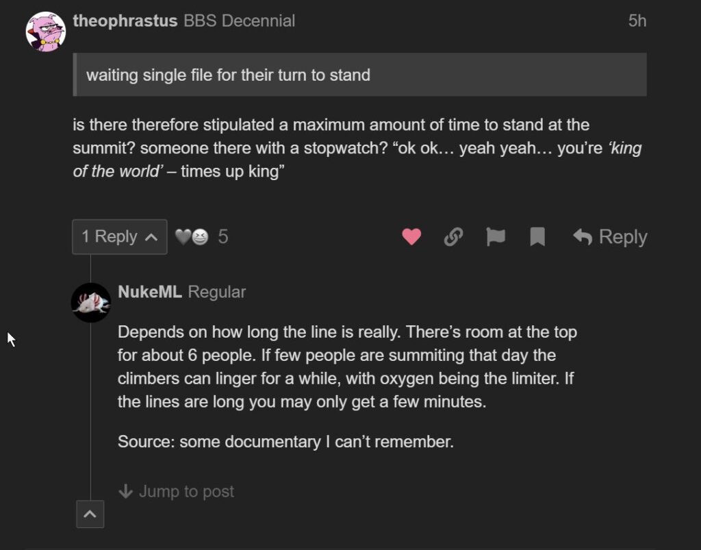 About that…. I know nothing about mountaineering. But I’m curious about two things specifically about Everest.: