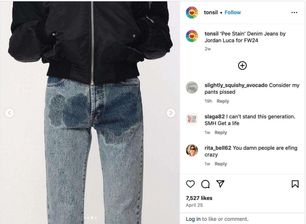 Posted in Article things that suggest mankind has run its course… 2024-05-14 Leave a Comment on things that suggest mankind has run its course… in reverse cron order. Pee-stained jeans. >USD$1,000. There is a waiting list.