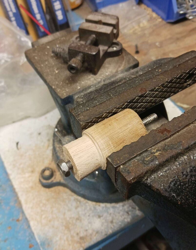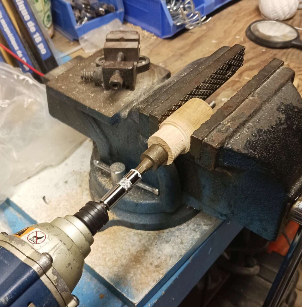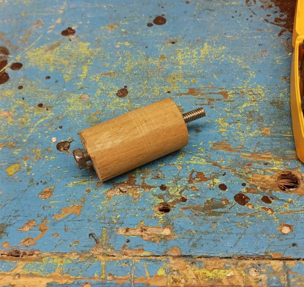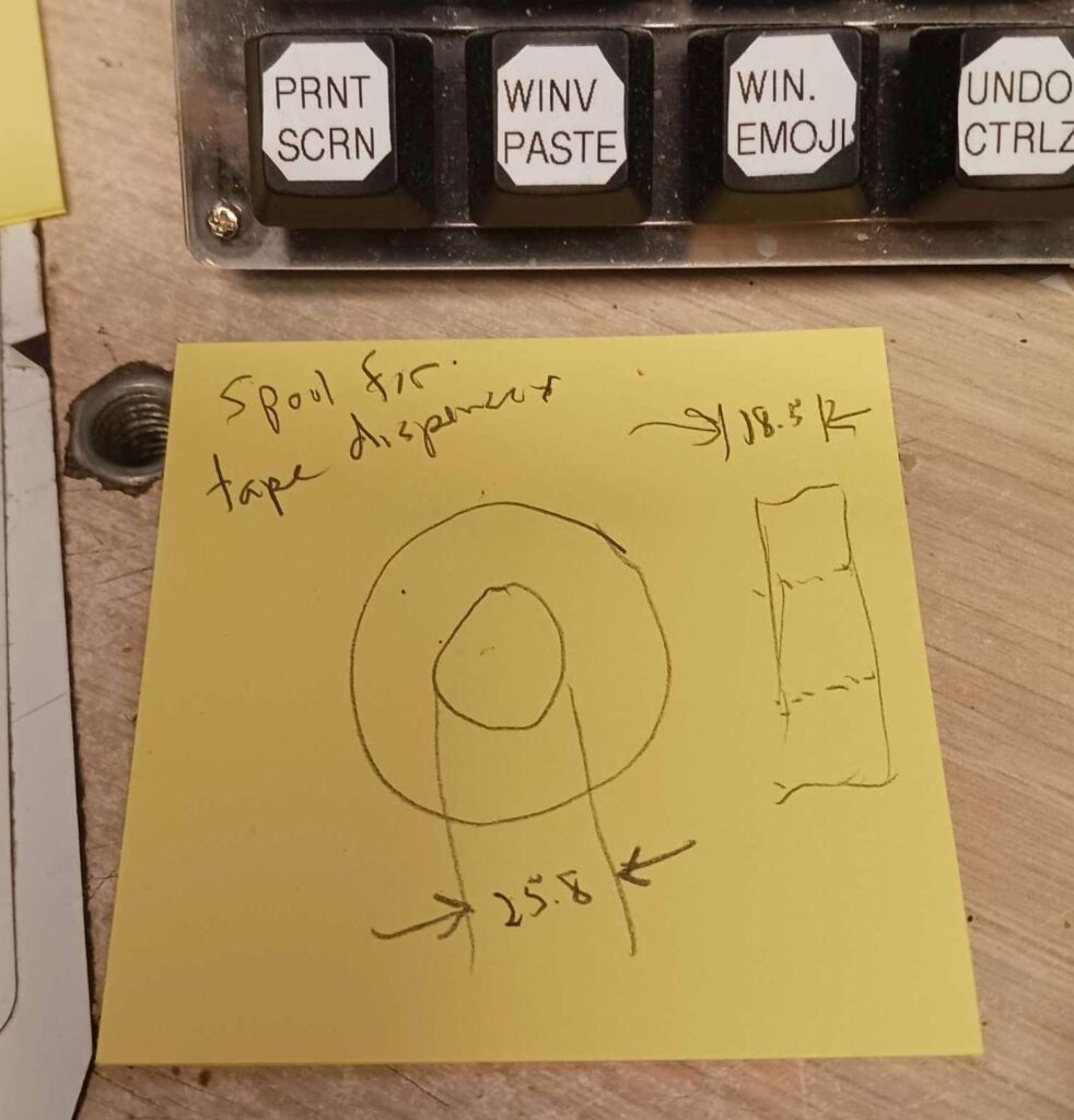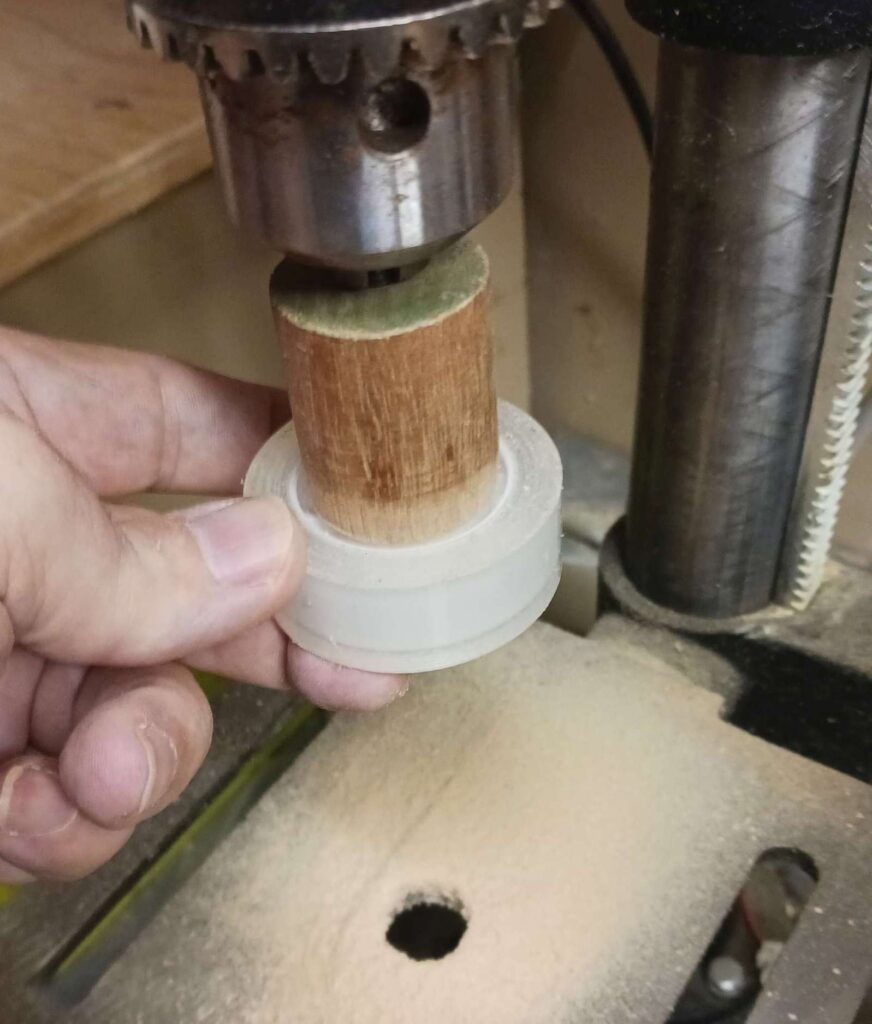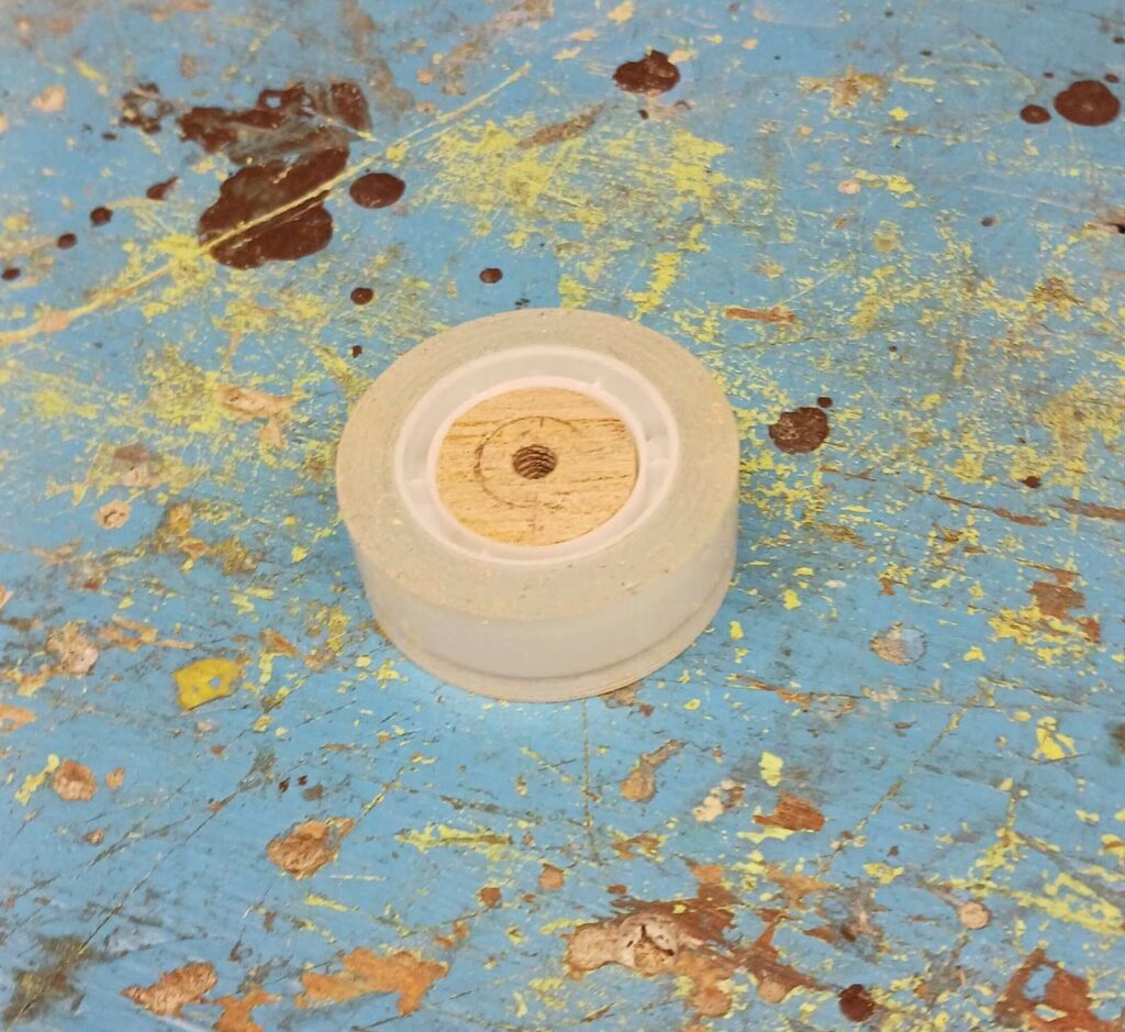 lost the little plastic spool that hold the roll of tape in my desktop tape dispenser; it is one of the best things i have, but is absolutely useless without the spool holding the tape roll; the spool is in the room cave somewhere, but no amount of looking has turned it up; so must make a replacement. fred flinstone quality. used my drill press as a poor man’s lathe, reduced a pc of 1.5″ wood dowel to fit; pc of discarded (but kept just for this sort of thing!!) coat hanger wire as the spindle for the spool (could be 2x diameter, but works. it’s not a freaking bearing.
