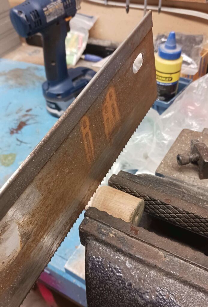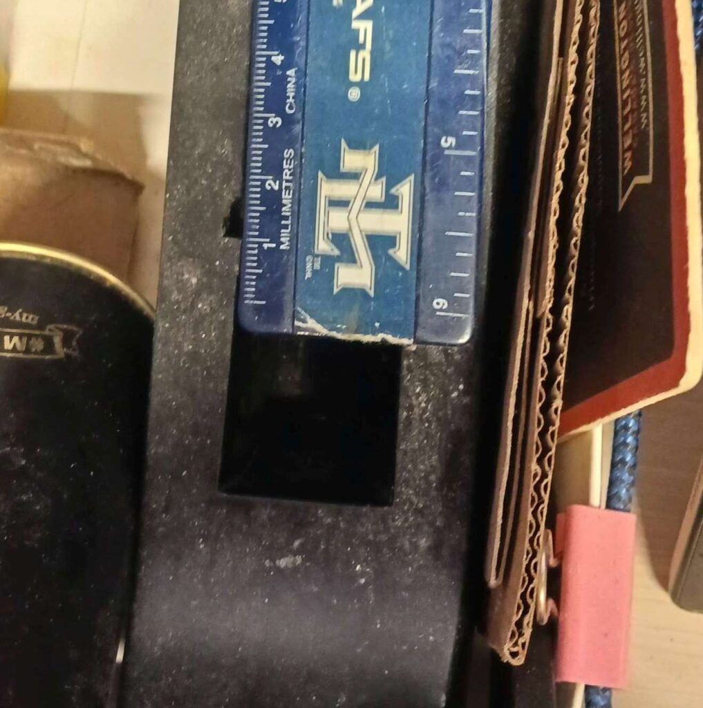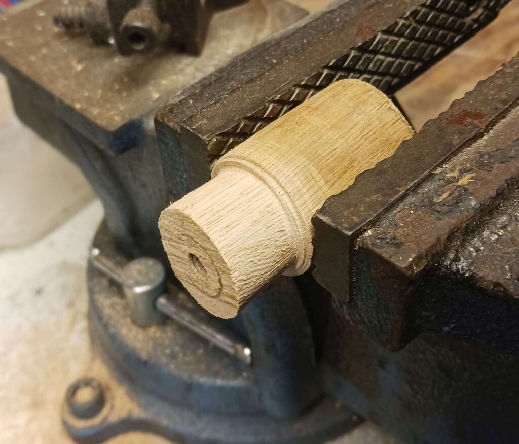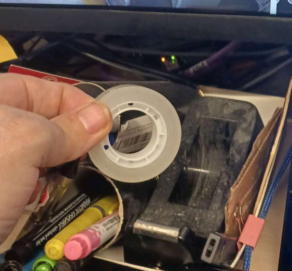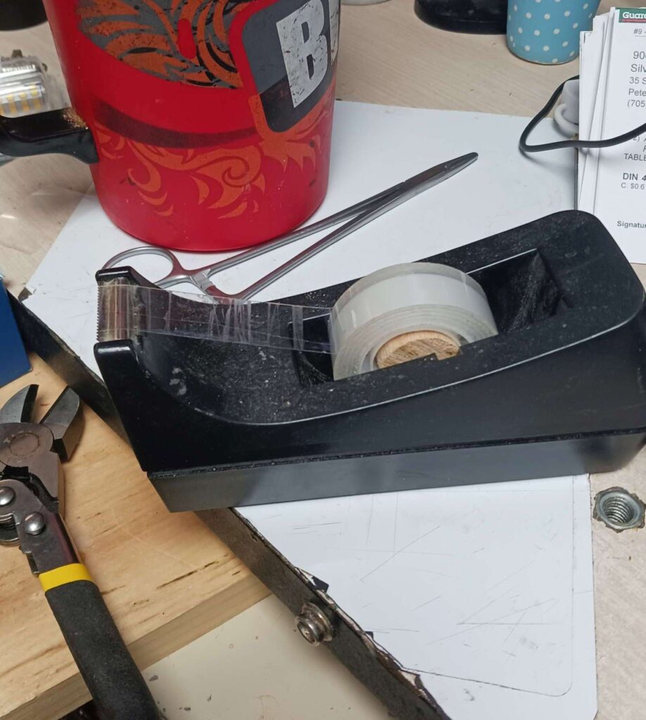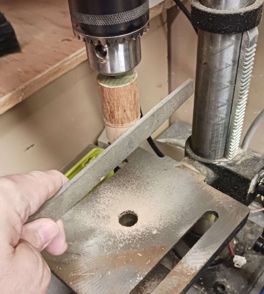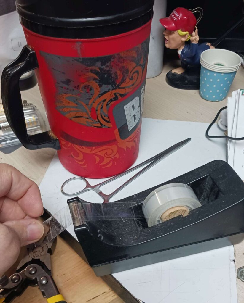 lost the little plastic spool that hold the roll of tape in my desktop tape dispenser; it is one of the best things i have, but is absolutely useless without the spool holding the tape roll; the spool is in the room cave somewhere, but no amount of looking has turned it up; so must make a replacement. fred flinstone quality. used my drill press as a poor man’s lathe, reduced a pc of 1.5″ wood dowel to fit; pc of discarded (but kept just for this sort of thing!!) coat hanger wire as the spindle for the spool (could be 2x diameter, but works. it’s not a freaking bearing.