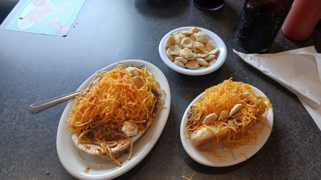 Stopped for lunch at Skyline in Cincinnati. Small 3-way + 1 Cheese Coney