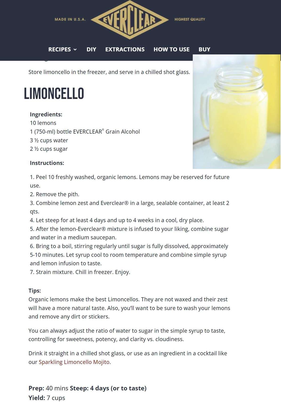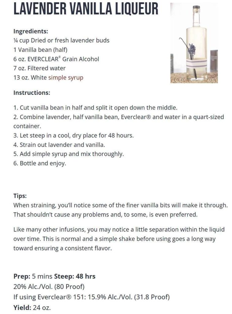 Posted in Article what to do with Everclear – Limoncello? 2024-06-22 Leave a Comment on what to do with Everclear – Limoncello? bought a 750ml bottle 190 proof (95% grain alcohol); need ideas for what to do with it. see also: nearly blowing my head off with a shot of Everclear From Everclear’s website: Limoncello BLUEBERRY EARL GREY LIQUEUR LAVENDER VANILLA LIQUEUR