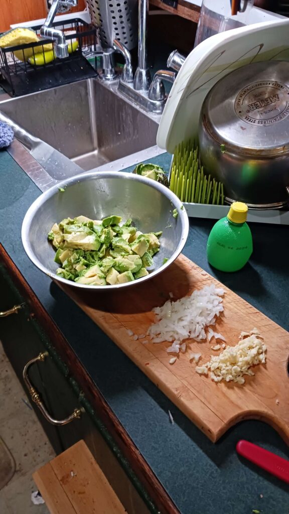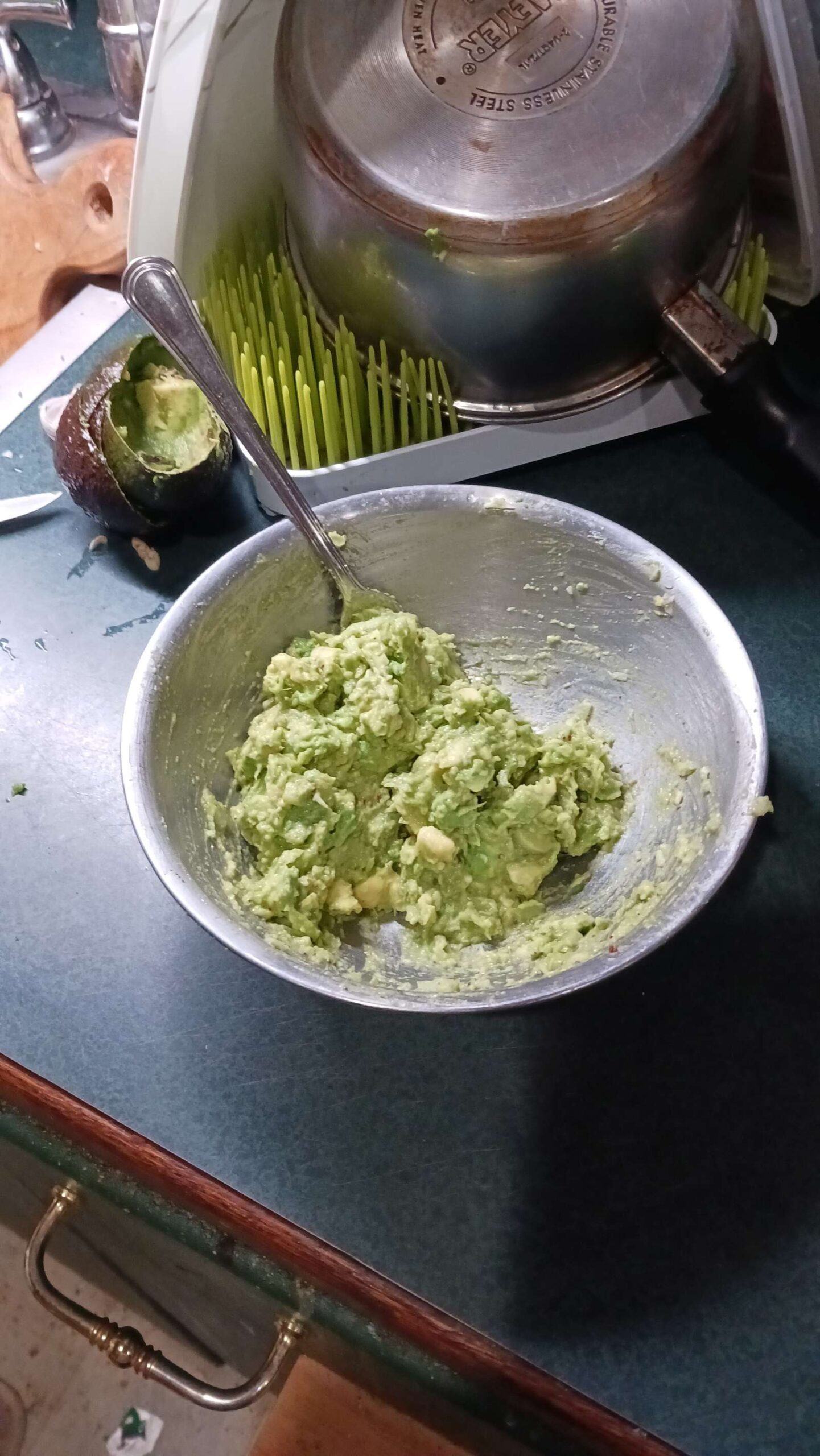 simple guacamole, 2 ripe hass avocados, 2 tb minced onion, 2 TB minced garlic, and some lime TB? (here from the squeezer bulb, better with real limes)…