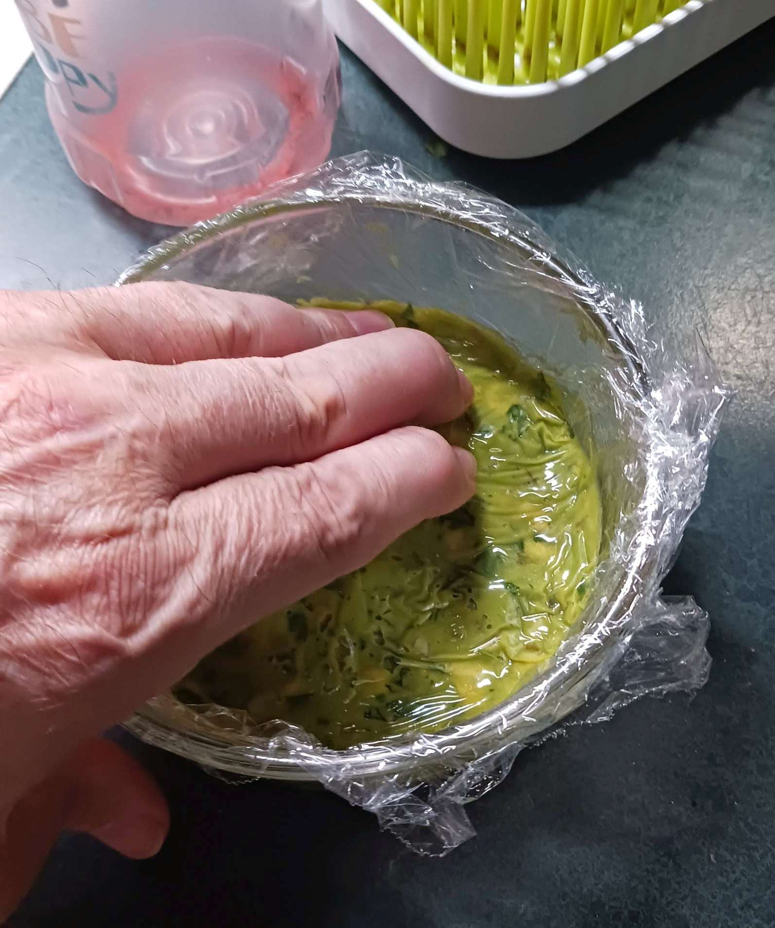 not really a secret: prevent air (oxygen?) from oxisdizing the sugars?? in the avocado; like a brown-sh (but not too brown!) banana or a bruised apple, it’s fine to eat and tastes more or less fine. but unappetizing af. to me the secret is to sooth out the surface of the guac, with the back of a spoon. then a single layer (multiple layers maybe better?) of kitchen wrap carefully “tamped down” on the smoothed surface, taking care to push bubbles out from the center, and run a thumb squeezer on the verticle walls (which you cleaned off first, right?). will still be green in 24 hours which i am writing about right now and considering getting some, offering joan who’s at work but has breaks between calls unless really busy