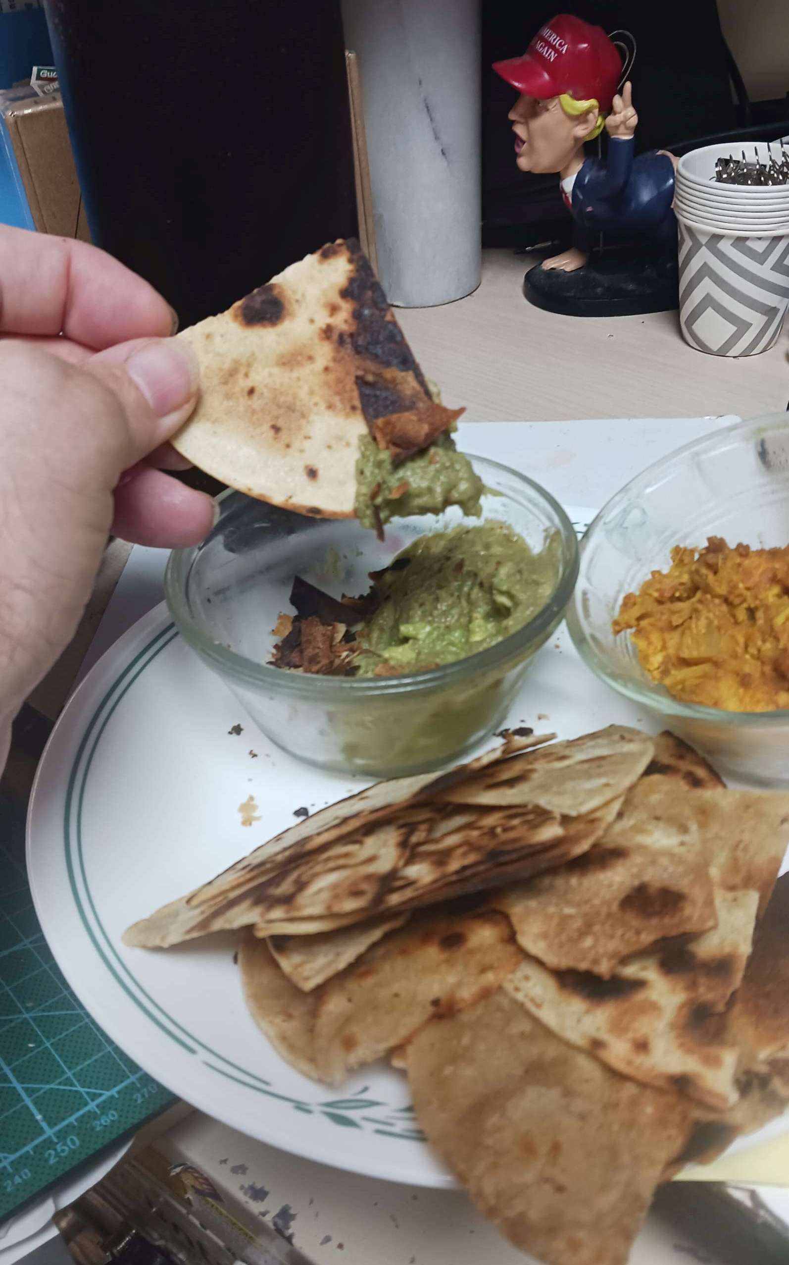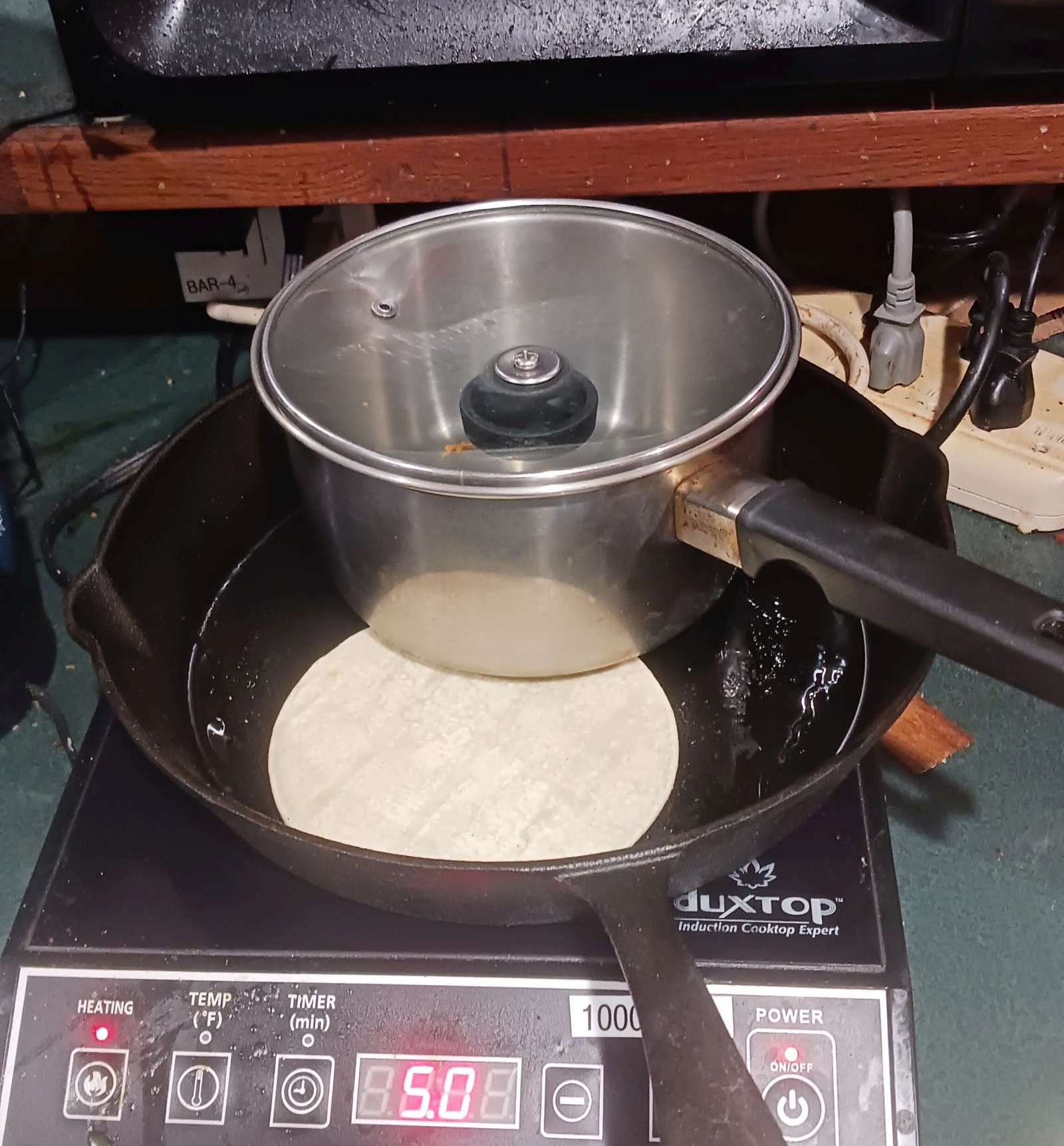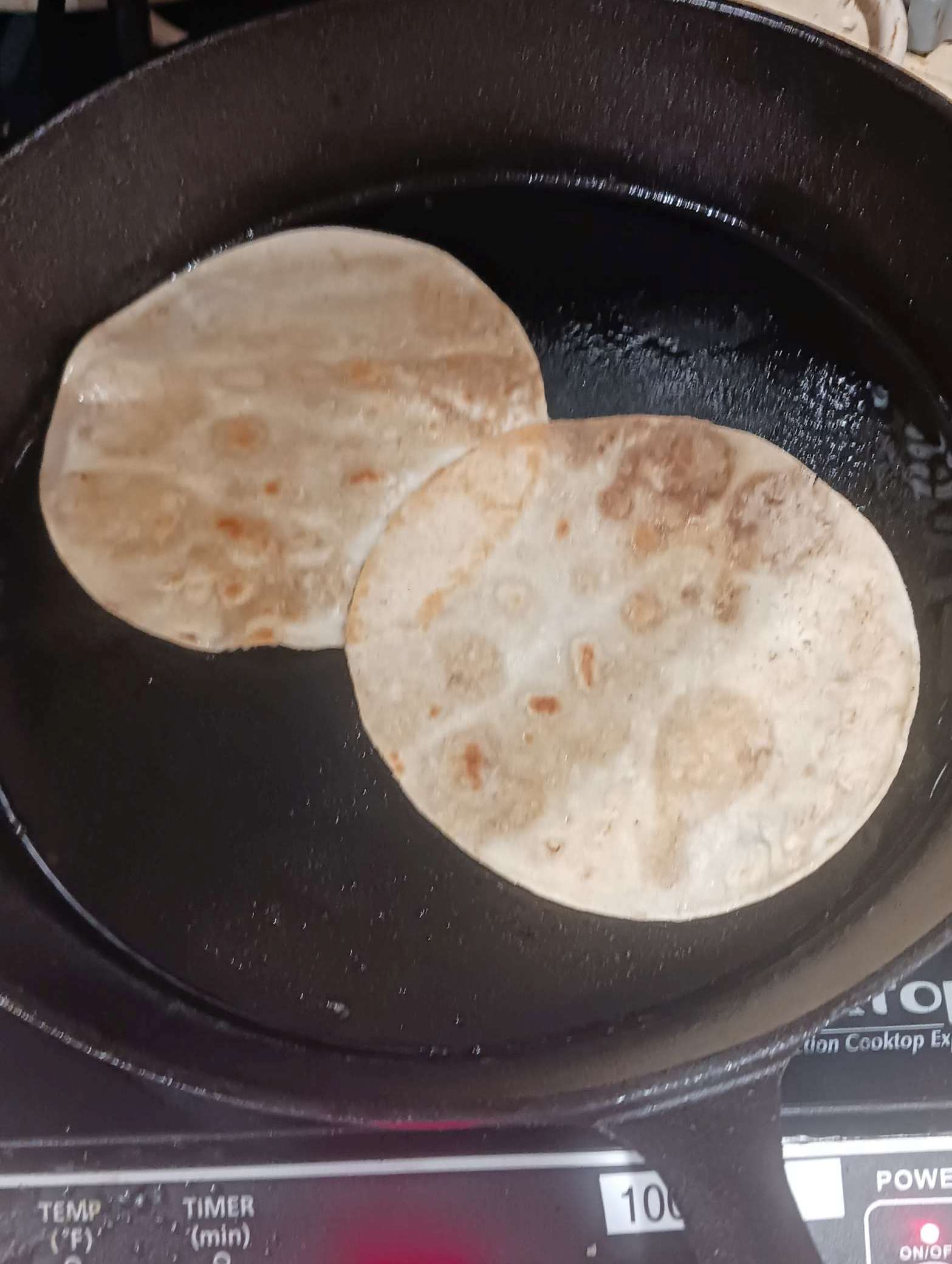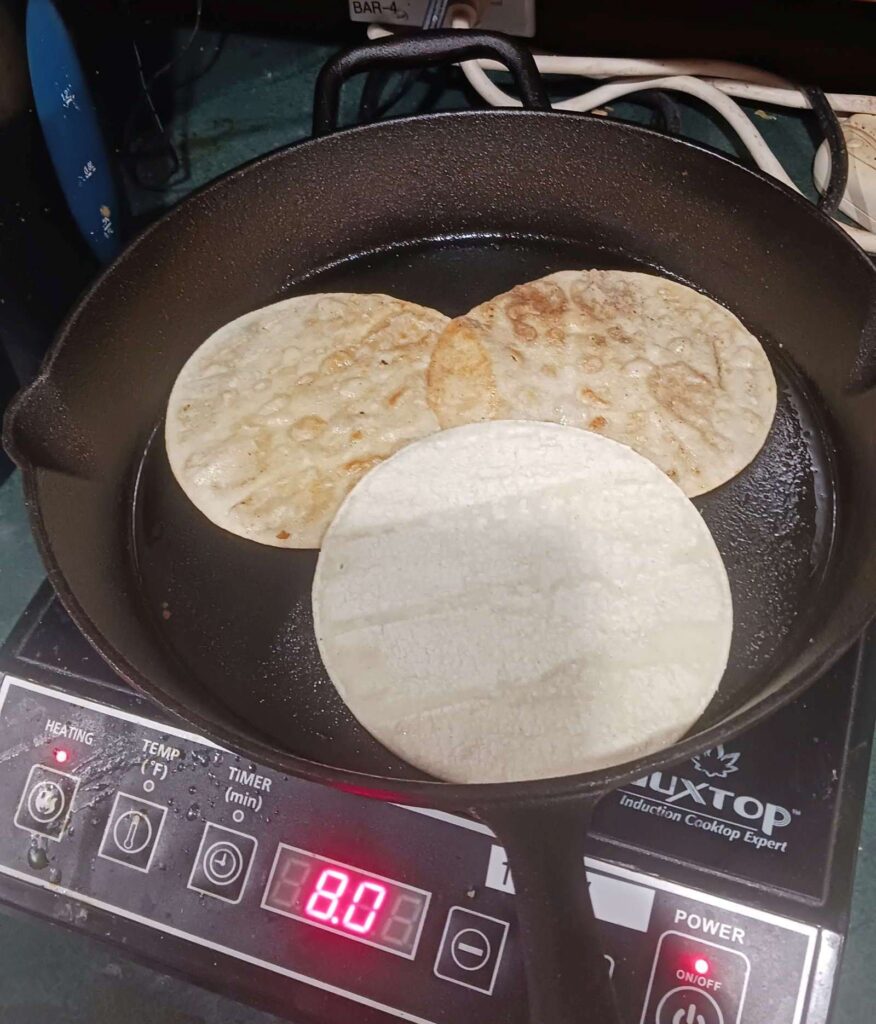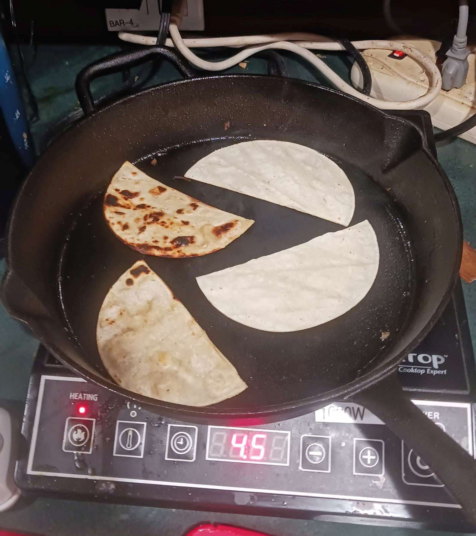 dilemma: i have a small bit of guacamole and a small bit of Paneer Bhurji, both of which would be excellent with some sort of crispy nacho product. but also, non avail. but i do have small corn tortillas, which are the input to nachos. but nachos are usually deep-fried, and don’t like deep frying. could sahallow fry in pan, but still hate the mess and dealing with the oil. so let’s try doing them dry in the cast iron. how bad could it be?