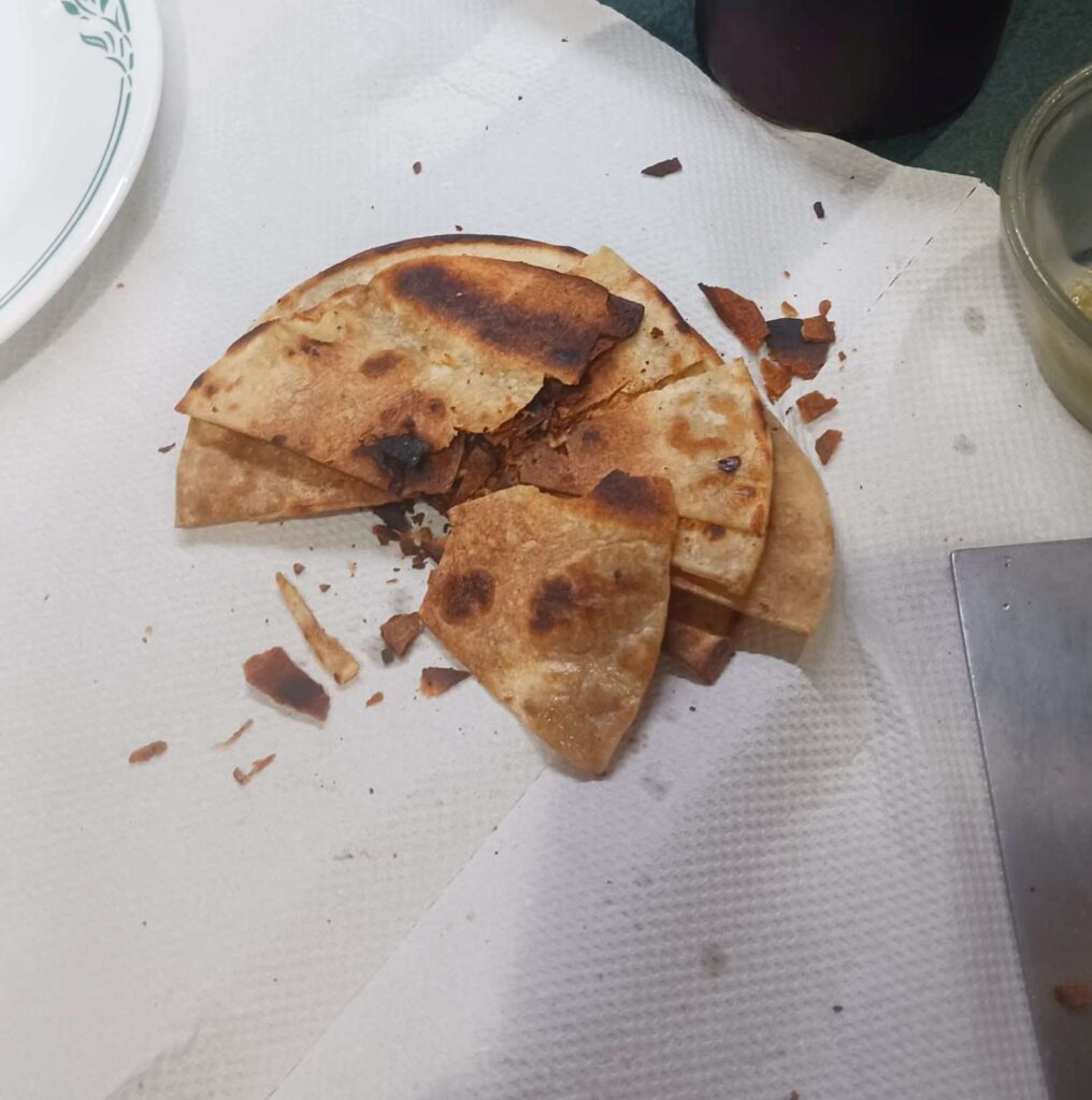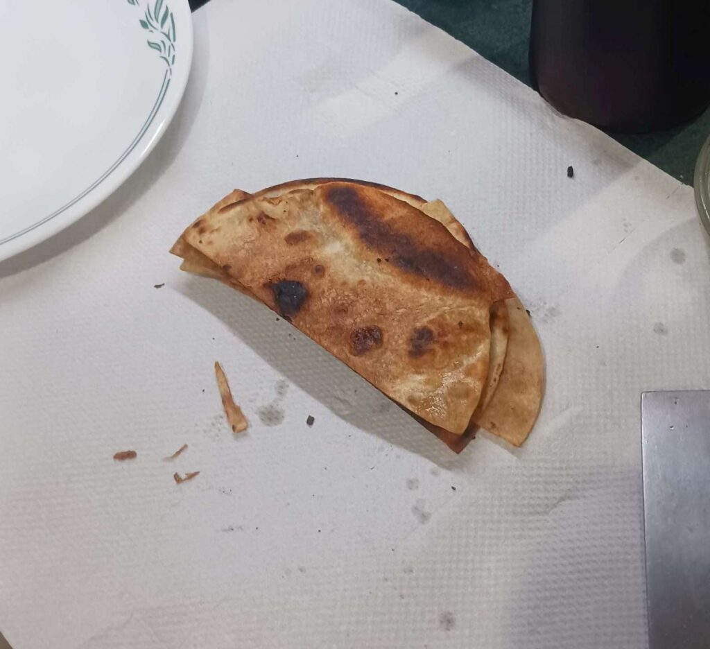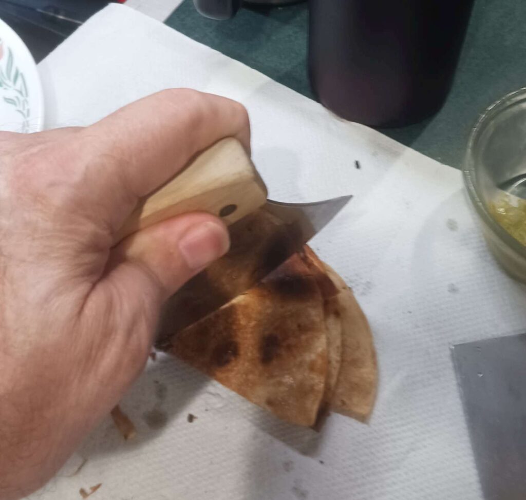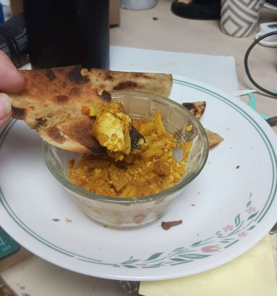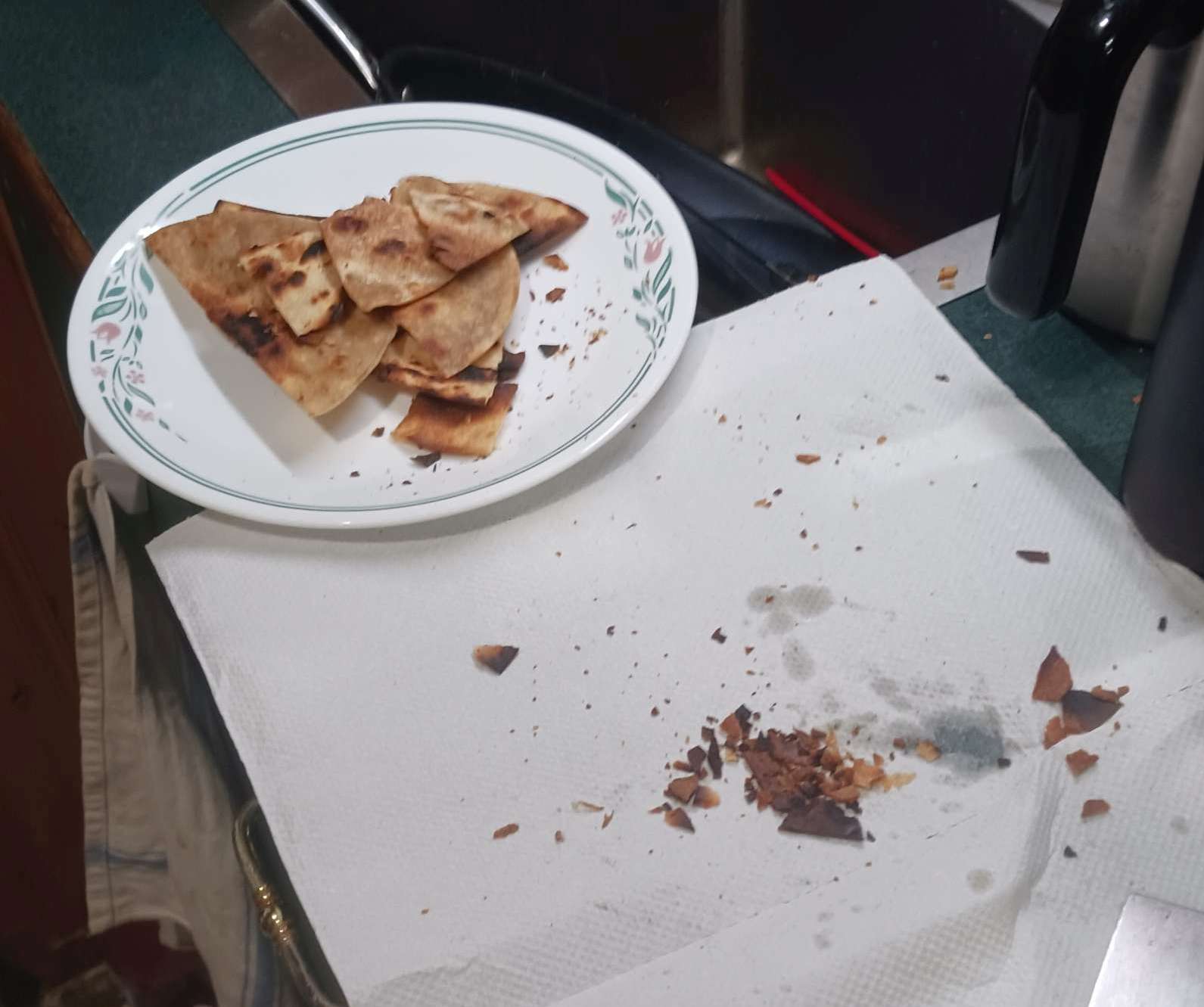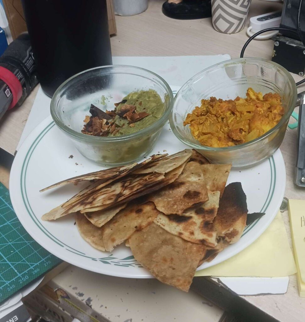 dilemma: i have a small bit of guacamole and a small bit of Paneer Bhurji, both of which would be excellent with some sort of crispy nacho product. but also, non avail. but i do have small corn tortillas, which are the input to nachos. but nachos are usually deep-fried, and don’t like deep frying. could sahallow fry in pan, but still hate the mess and dealing with the oil. so let’s try doing them dry in the cast iron. how bad could it be?