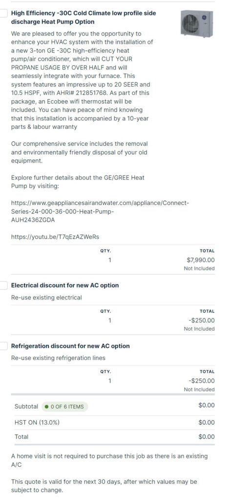 so: replace ac unit with ccASHP, whgich will make for a”hybride” system, leaving the ng furnace in place (might upgrade motor to DC for reasons??); smart thermostat (they will give an Ecobee, by Mike Boyle sez they can use my AprilAir 8920w??) that i got for auction$$), assuming it works; if not, use the cobee (but confirm it works with either./boith Alaexa and Homeassistant.,) smart thermostat with use the ng furnace when it’s cold enough (likely what the -30C maeans? which is pretty rare in ptbo. (neeed to get historical data like I used to.,…)