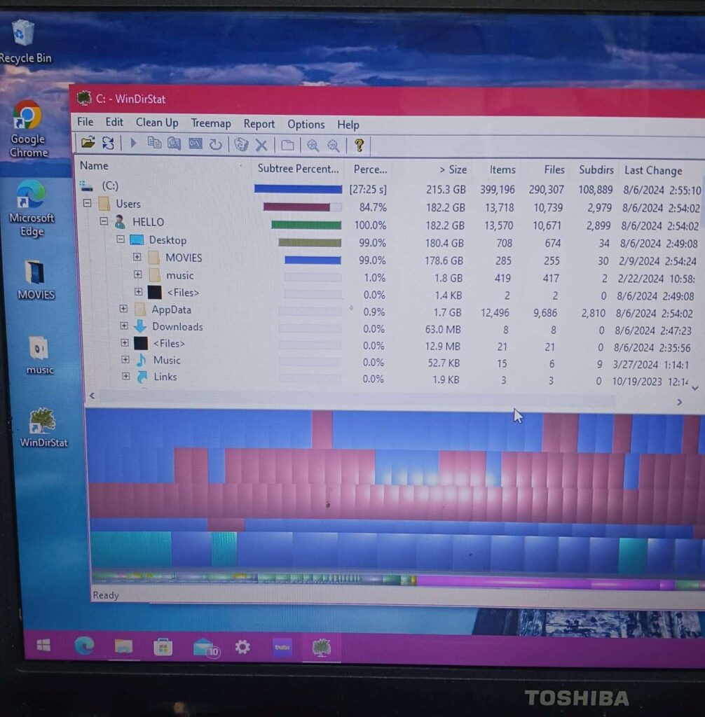 windirstat shows 99% of disk is used by \users\HELLO\Desktop\MOVIES – will want these files, or most of them, deleted before backup