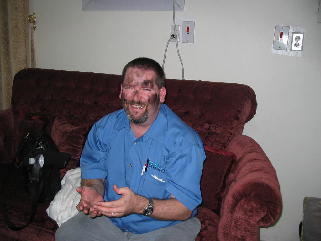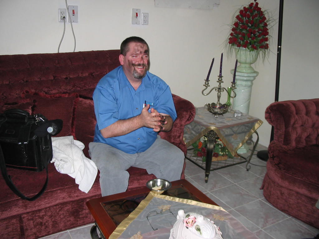 Musallam Tumasy (sp?) was my main contact at ?? in Saudi Arabia; this was during my visit to SA with Lawry L. while doing the install at Ramsis in Bahrain with Danilo F.); he invited us to supper, which we accepted; Lawry had mentioned I was very scientif c and logical, and Musaallam decied to play a prank on me; apparently this is an old prank, where you cover the bottom of a bowl etc with soot by holding a candle under it. then the mark (me in this case) is lead thru a series of steps about this magical bowl/candle/box etc, endsure the findegers go to the bottom of the bowl, then up to the face, thus marking the face with sdoot.