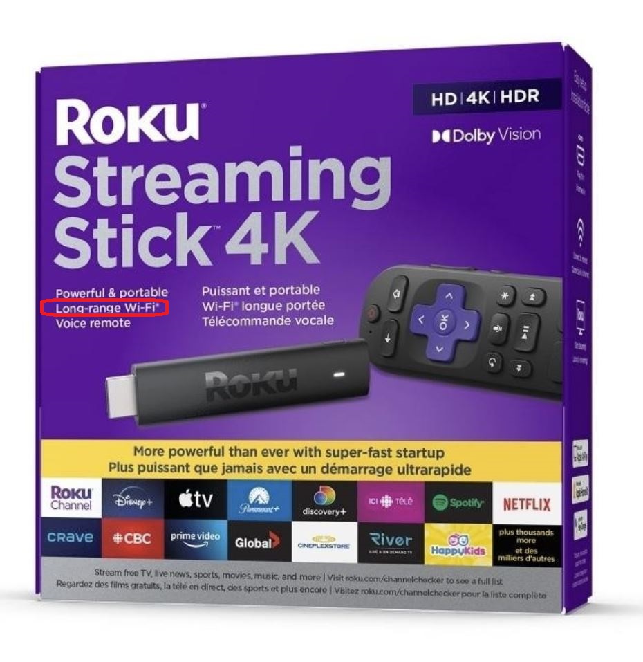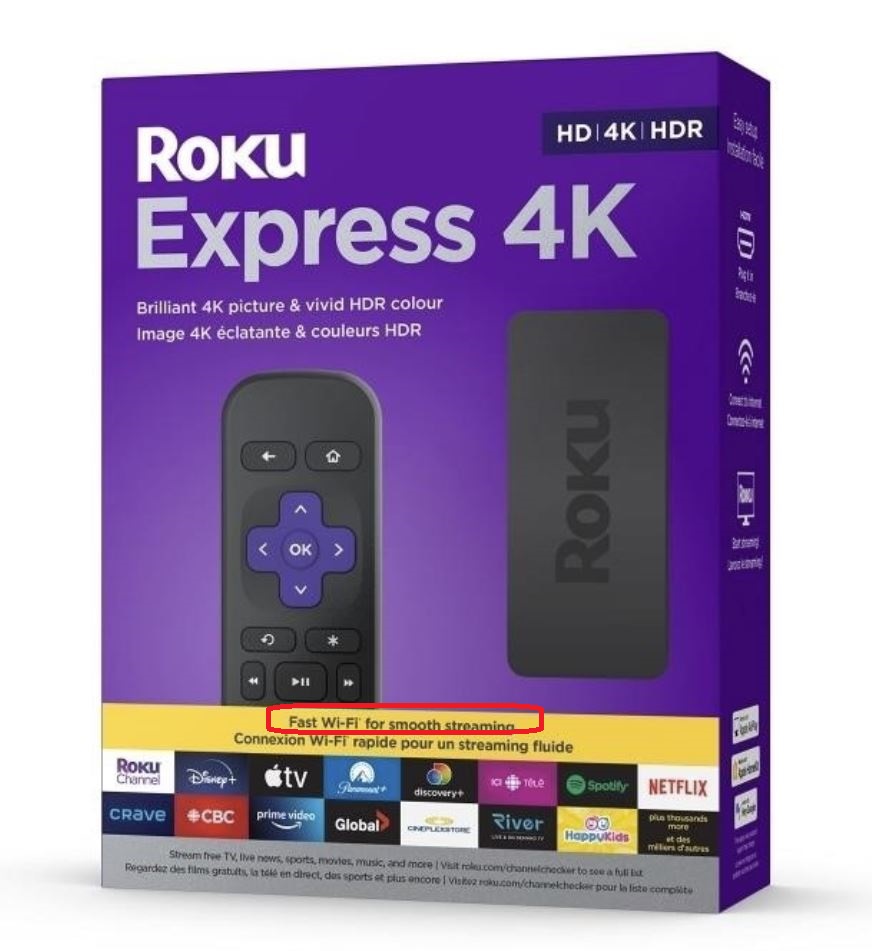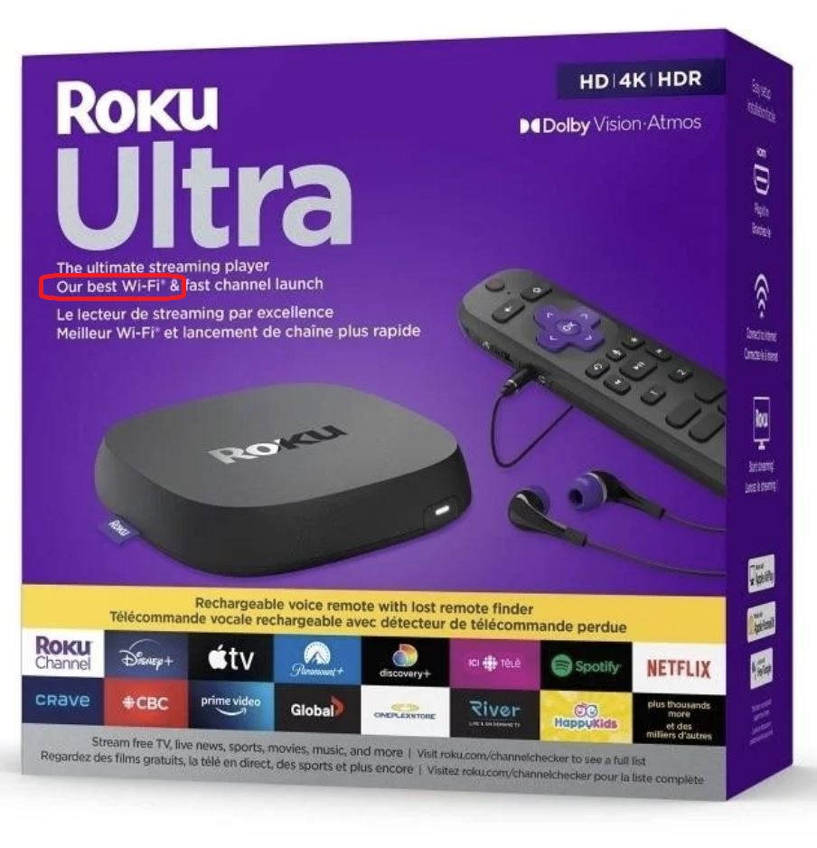 roku labels their wifi streaming devices as “Long range WiFi” (2.4GHz) or “Fast Wifi” (5GHz). I find this dumb. although it is true that using 5Ghz means lower range. My experience is 2.4GHz, while technically capable of speeds sufficnet for up to 4K, is so over-used and polluted and affected by microwave ovens, etc, it’s best to use the 5GHz range (or just wire the thing!) Except only the “Ultra” has an Ethernet port… And of course the info for this will be on the box, but it should be on the front in the most commonly used terms (2.4GHz and 5GHz). And don’t get me started on the 5GHz (WiFi) vs. 5G (cellular wireless), two totally different things.