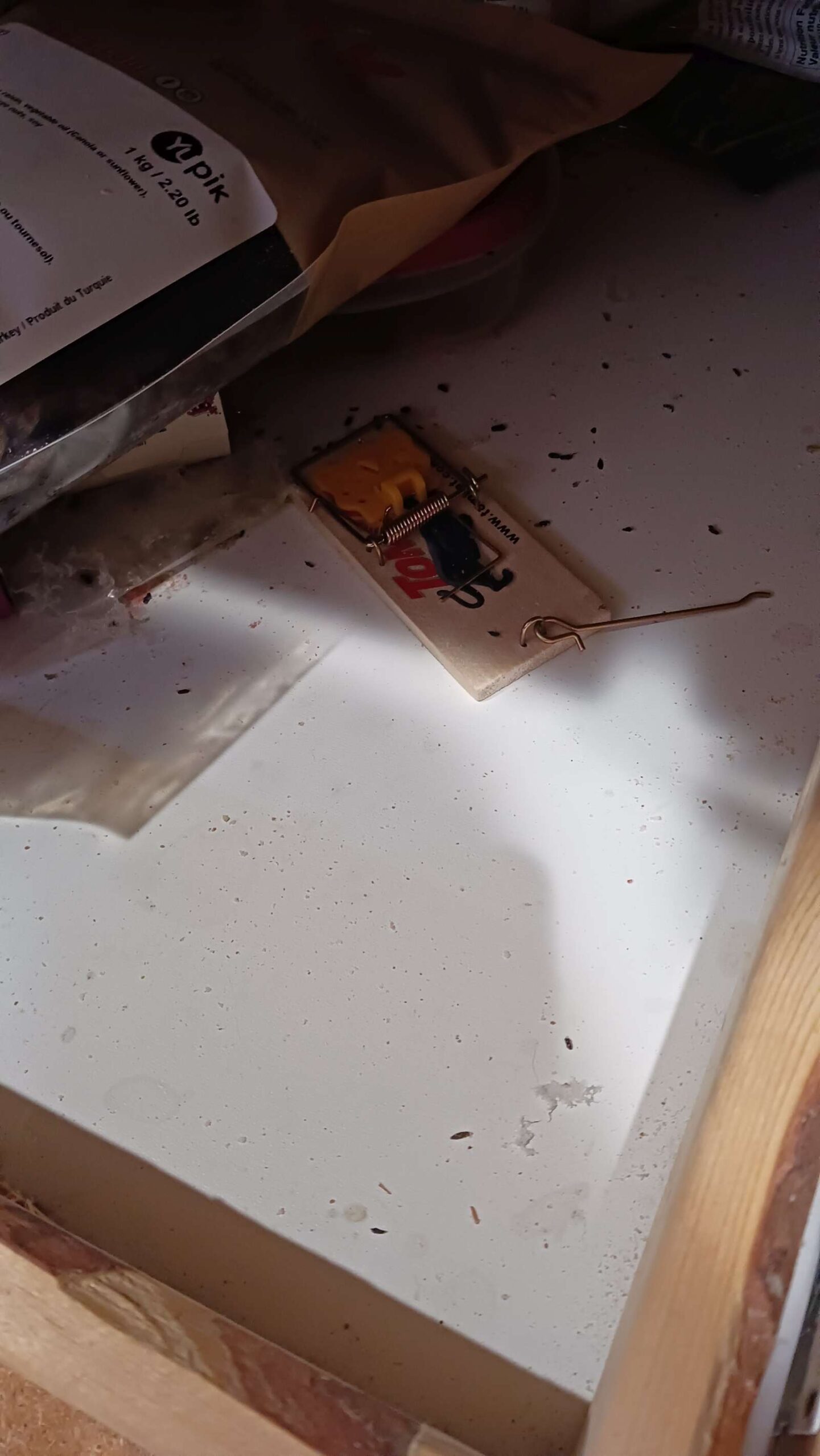 joan bought some sort of poison food trtaps; set one in drawer floor where mouse #2 died, next day seems there is disturbancer of food, and no more for th e next week