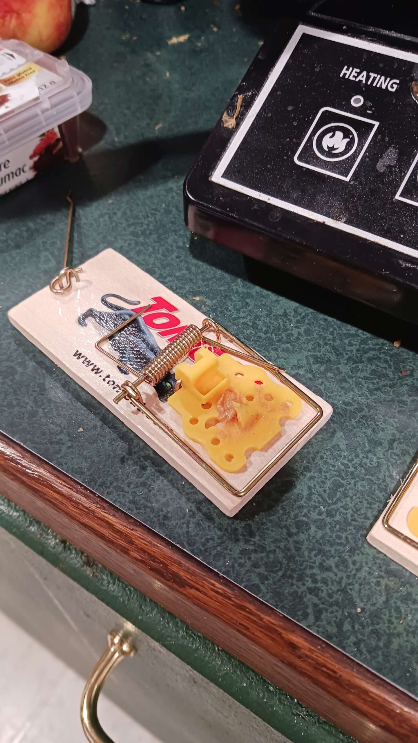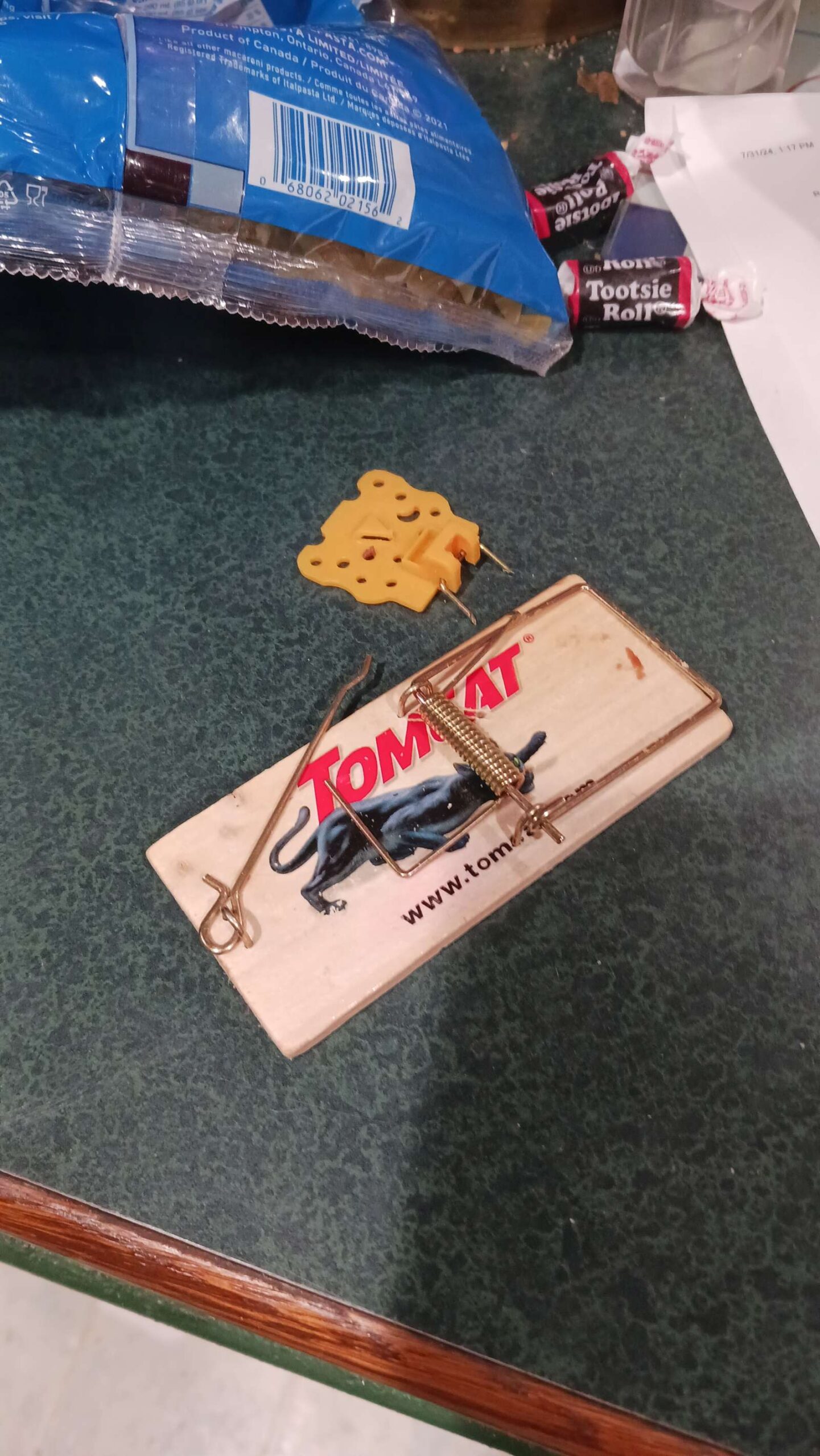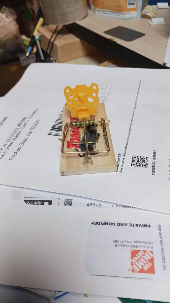 2 days later: got mouse in cheese trap in laundry room. notably, 80% of the cheese had been eaten, but he must have got greedy…
